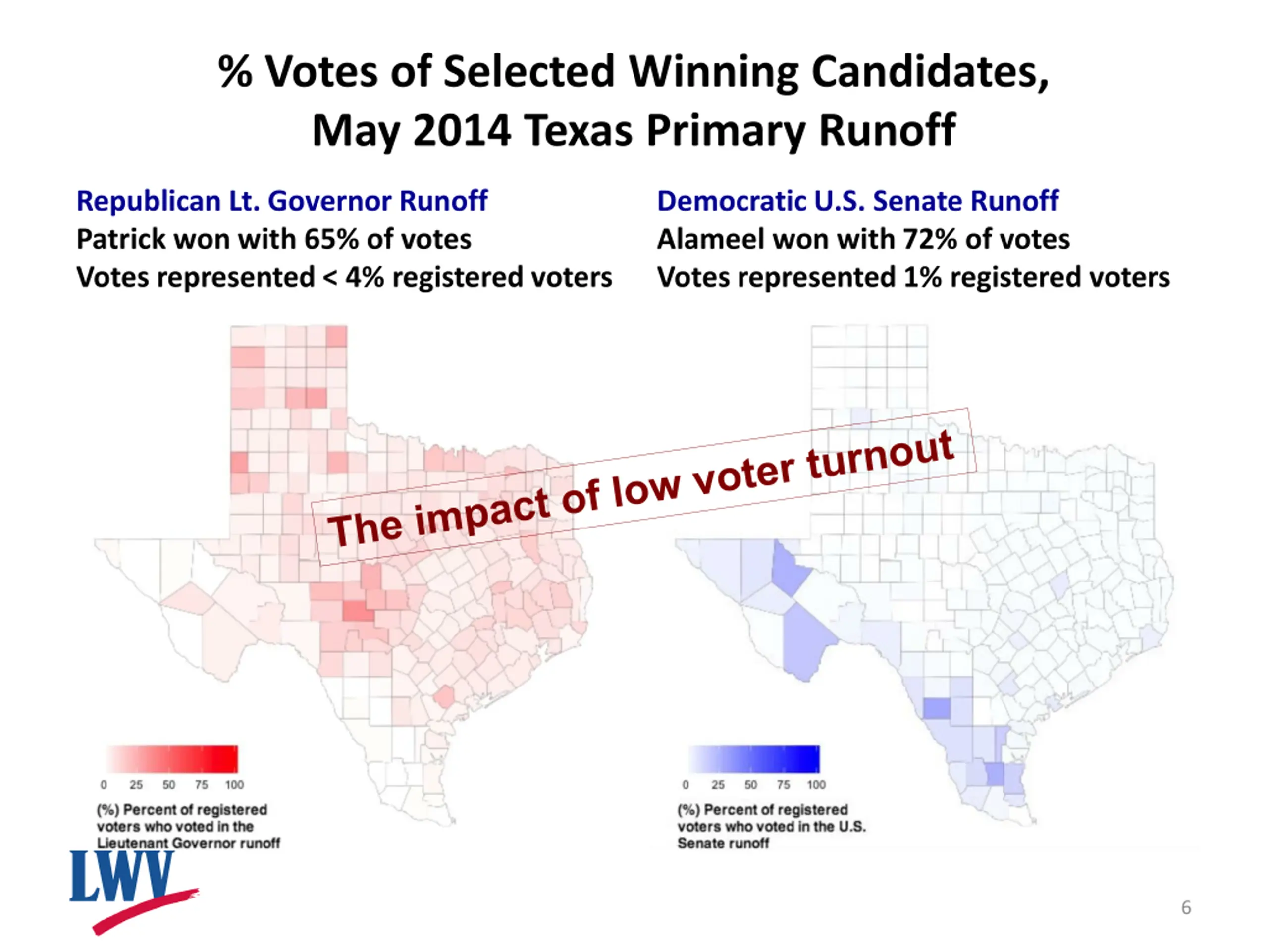 % Votes of Selected Winning Candidates, May 2014 Texas Primary Runoff Republican Lt. Governor Runoff Patrick won with 65% of votes Votes represented < 4% registered voters Democratic U.S. Senate Runoff Alameel won with 72% of votes Votes represented 1% registered voters 6