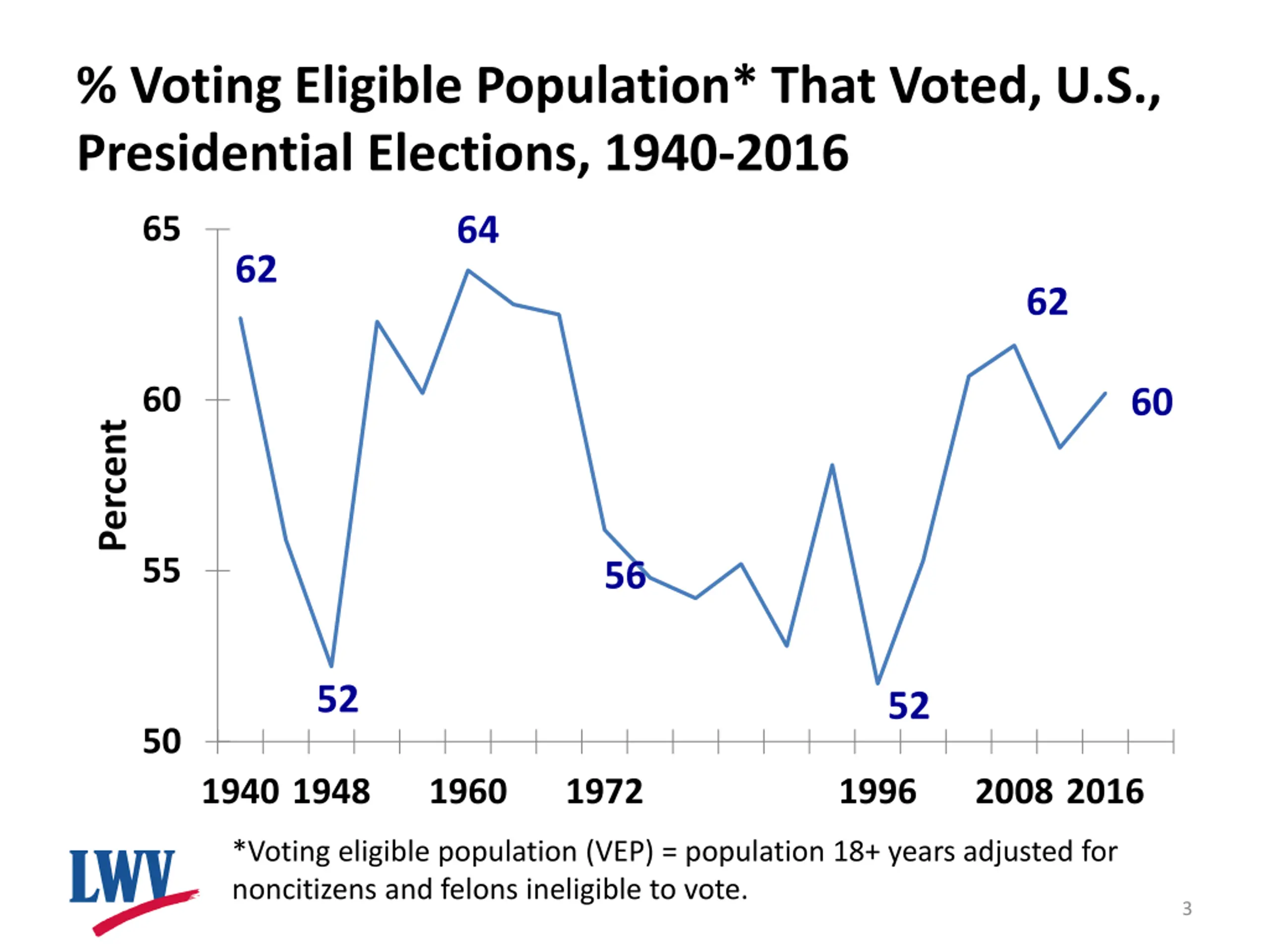 % Voting Eligible Population* That Voted, U.S., Presidential Elections, 1940-2016 64 65 62 62 60 60 Percent 55 56 52 52 50 1940 1948 1960 1972 1996 2008 2016 *Voting eligible population (VEP) = population 18+ years adjusted for noncitizens and felons ineligible to vote. 3