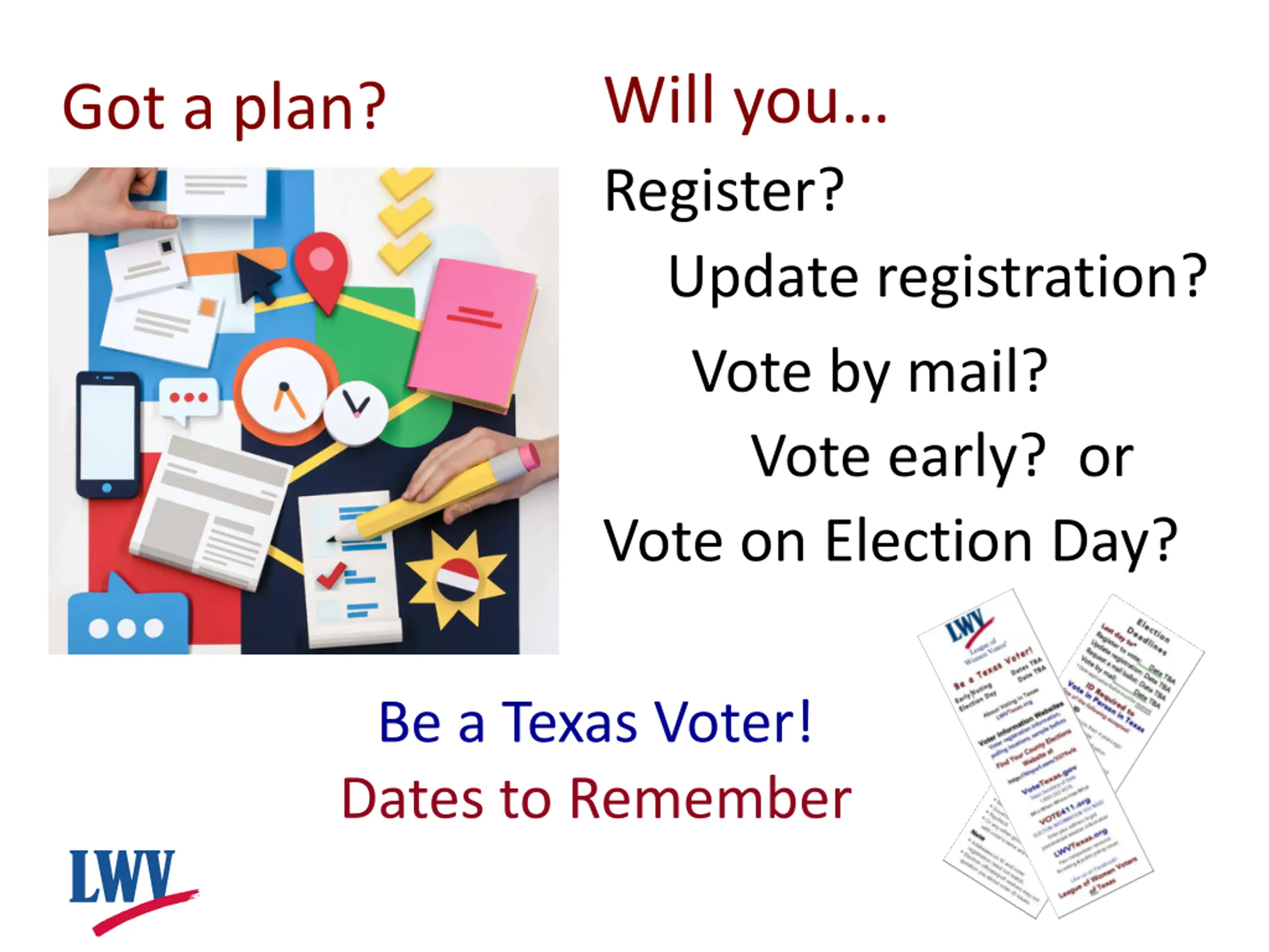 Will you Register? Update registration? Vote by mail? Vote early? or Vote on Election Day? Got a plan? Be a Texas Voter! Dates to Remember