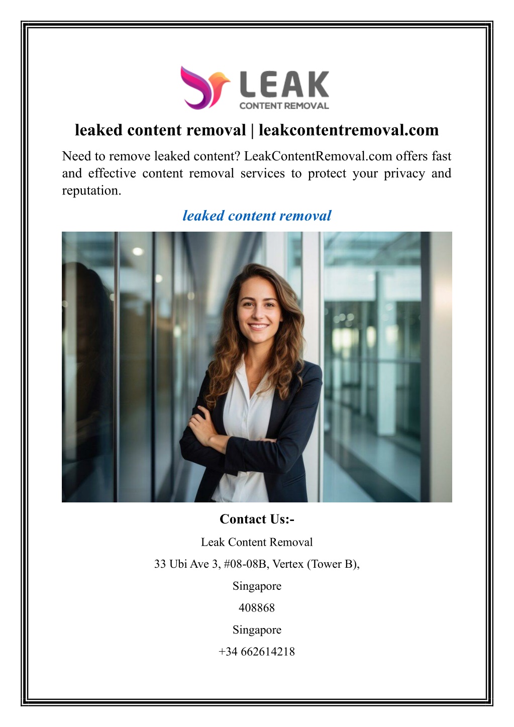 leaked content removal | leakcontentremoval.com Need to remove leaked content? LeakContentRemoval.com offers fast and effective content removal services to protect your privacy and reputation. leaked content removal Contact Us:- Leak Content Removal 33 Ubi Ave 3, #08-08B, Vertex (Tower B), Singapore 408868 Singapore +34 662614218