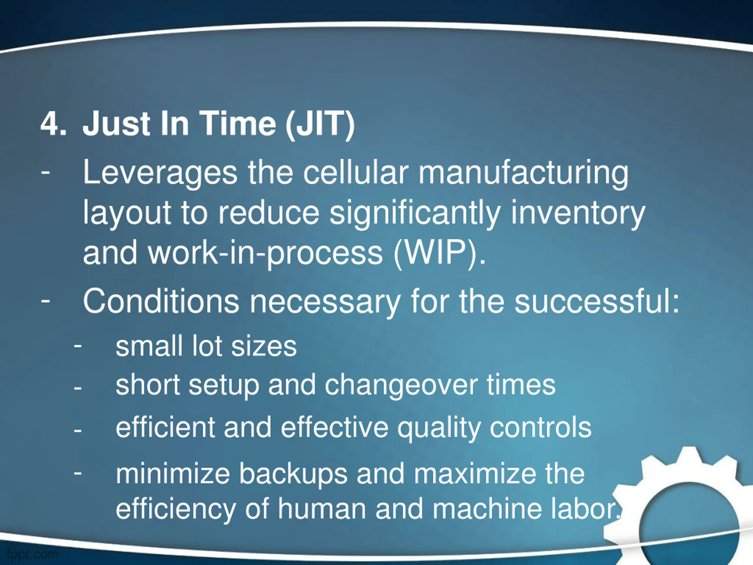 4. Just In Time (JIT) - Leverages the cellular manufacturing layout to reduce significantly inventory and work-in-process (WIP). Conditions necessary for the successful: - - - - minimize backups and maximize the efficiency of human and machine labor. - small lot sizes short setup and changeover times efficient and effective quality controls