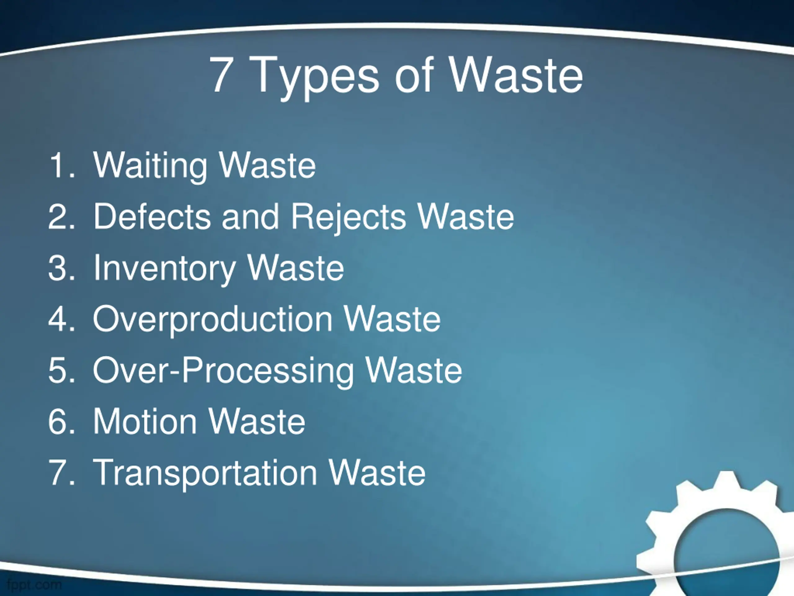 7 Types of Waste 1. Waiting Waste 2. Defects and Rejects Waste 3. Inventory Waste 4. Overproduction Waste 5. Over-Processing Waste 6. Motion Waste 7. Transportation Waste