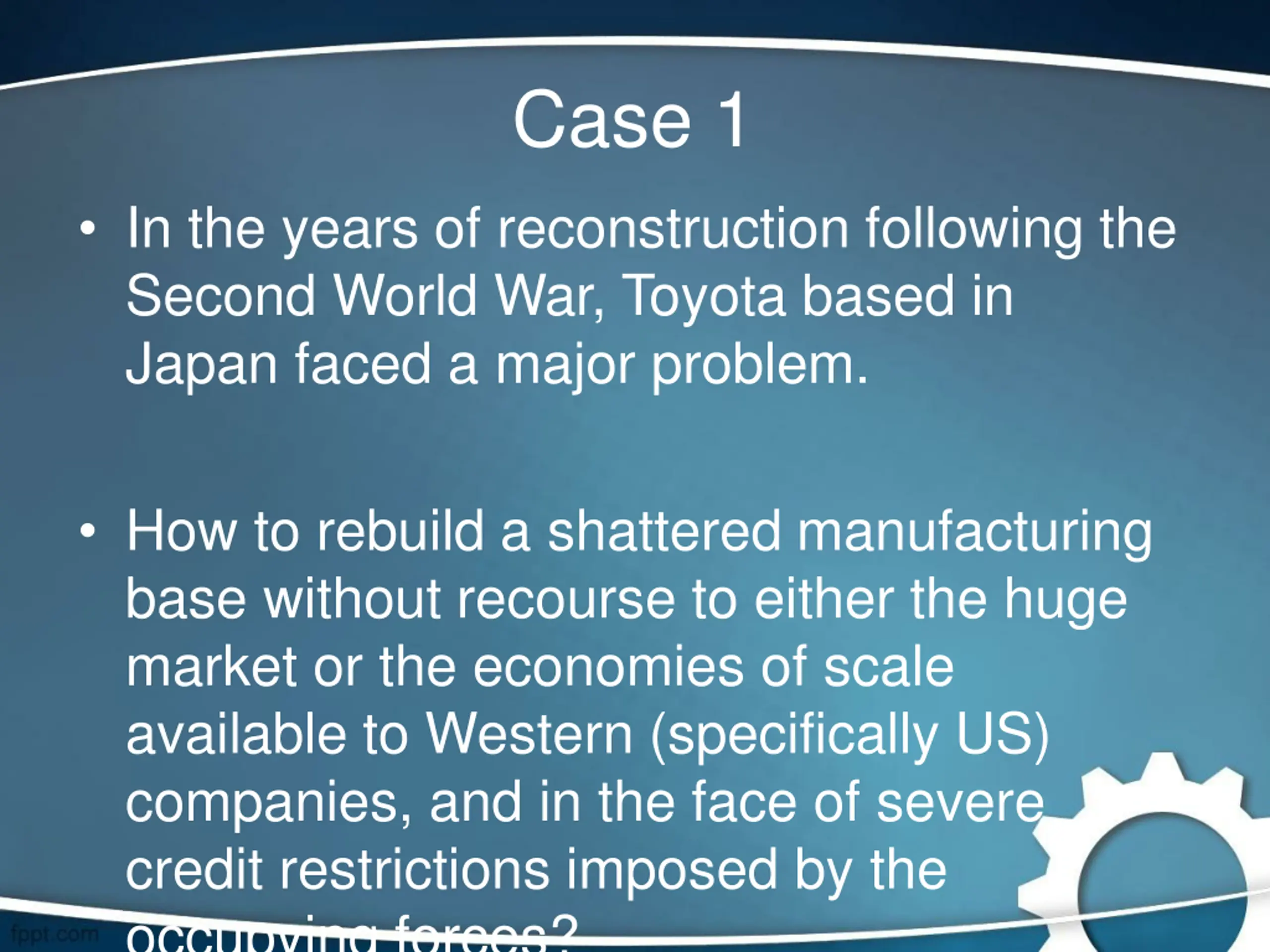 Case 1 In the years of reconstruction following the Second World War, Toyota based in Japan faced a major problem. How to rebuild a shattered manufacturing base without recourse to either the huge market or the economies of scale available to Western (specifically US) companies, and in the face of severe credit restrictions imposed by the occupying forces?