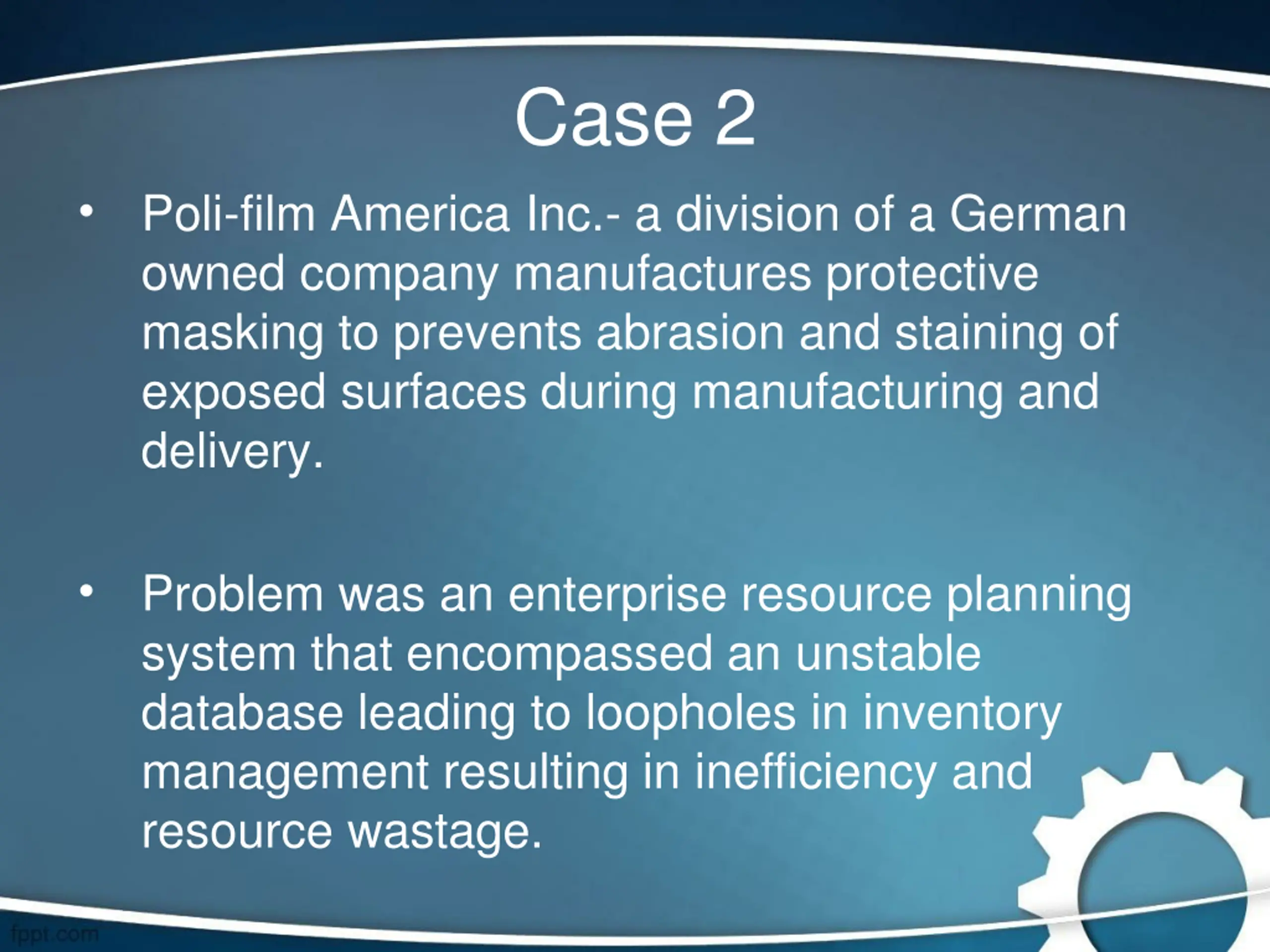 Case 2 Poli-film America Inc.- a division of a German owned company manufactures protective masking to prevents abrasion and staining of exposed surfaces during manufacturing and delivery. Problem was an enterprise resource planning system that encompassed an unstable database leading to loopholes in inventory management resulting in inefficiency and resource wastage.