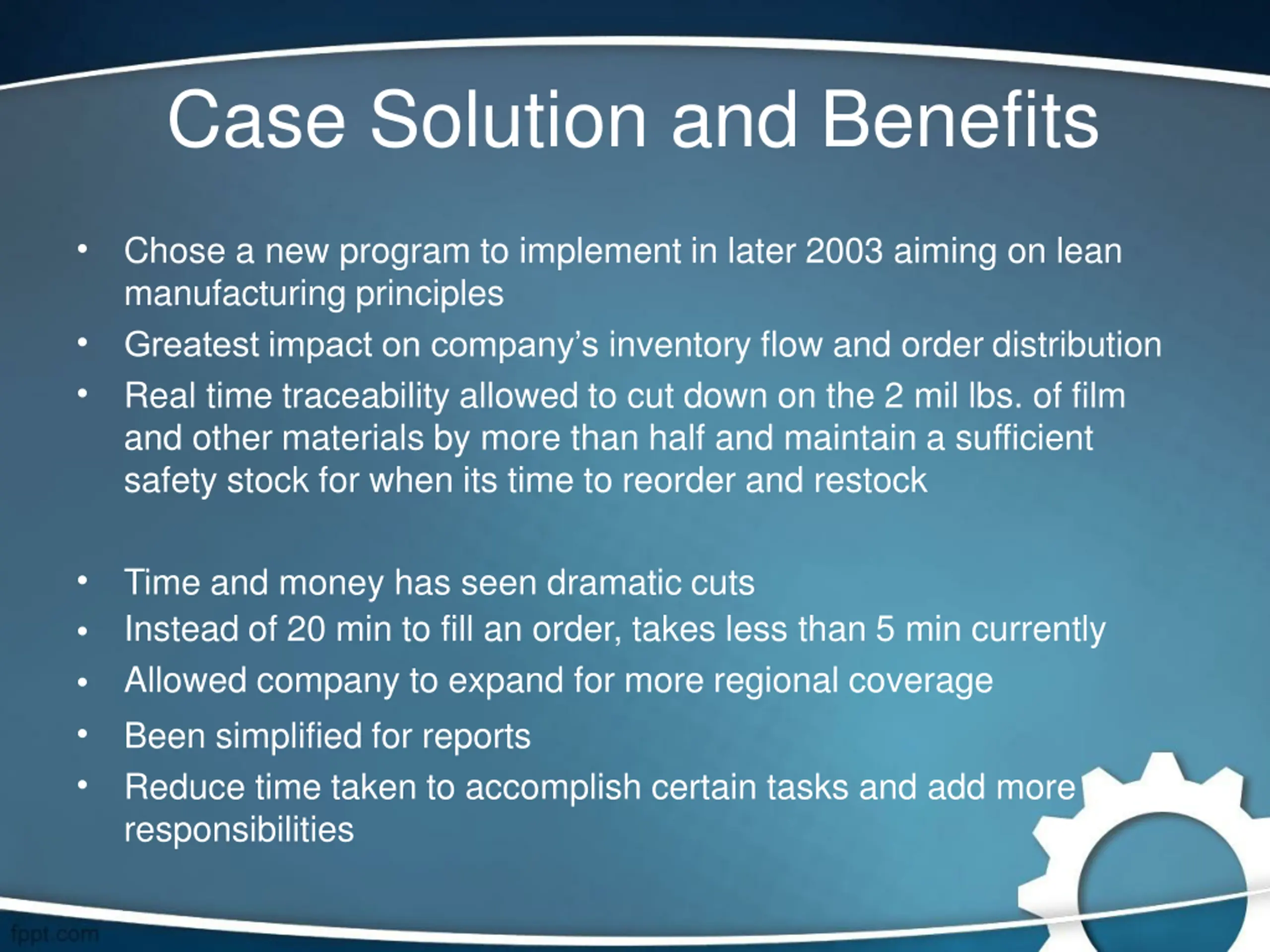 Case Solution and Benefits Chose a new program to implement in later 2003 aiming on lean manufacturing principles Greatest impact on company s inventory flow and order distribution Real time traceability allowed to cut down on the 2 mil lbs. of film and other materials by more than half and maintain a sufficient safety stock for when its time to reorder and restock Time and money has seen dramatic cuts Instead of 20 min to fill an order, takes less than 5 min currently Allowed company to expand for more regional coverage Been simplified for reports Reduce time taken to accomplish certain tasks and add more responsibilities