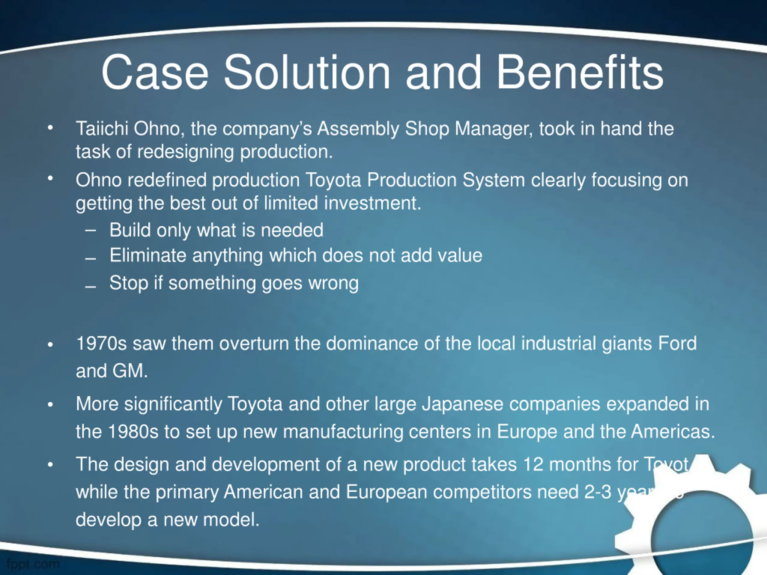 Case Solution and Benefits Taiichi Ohno, the company s Assembly Shop Manager, took in hand the task of redesigning production. Ohno redefined production Toyota Production System clearly focusing on getting the best out of limited investment. Stop if something goes wrong Build only what is needed Eliminate anything which does not add value 1970s saw them overturn the dominance of the local industrial giants Ford and GM. More significantly Toyota and other large Japanese companies expanded in the 1980s to set up new manufacturing centers in Europe and the Americas. The design and development of a new product takes 12 months for Toyot while the primary American and European competitors need 2-3 years to develop a new model.