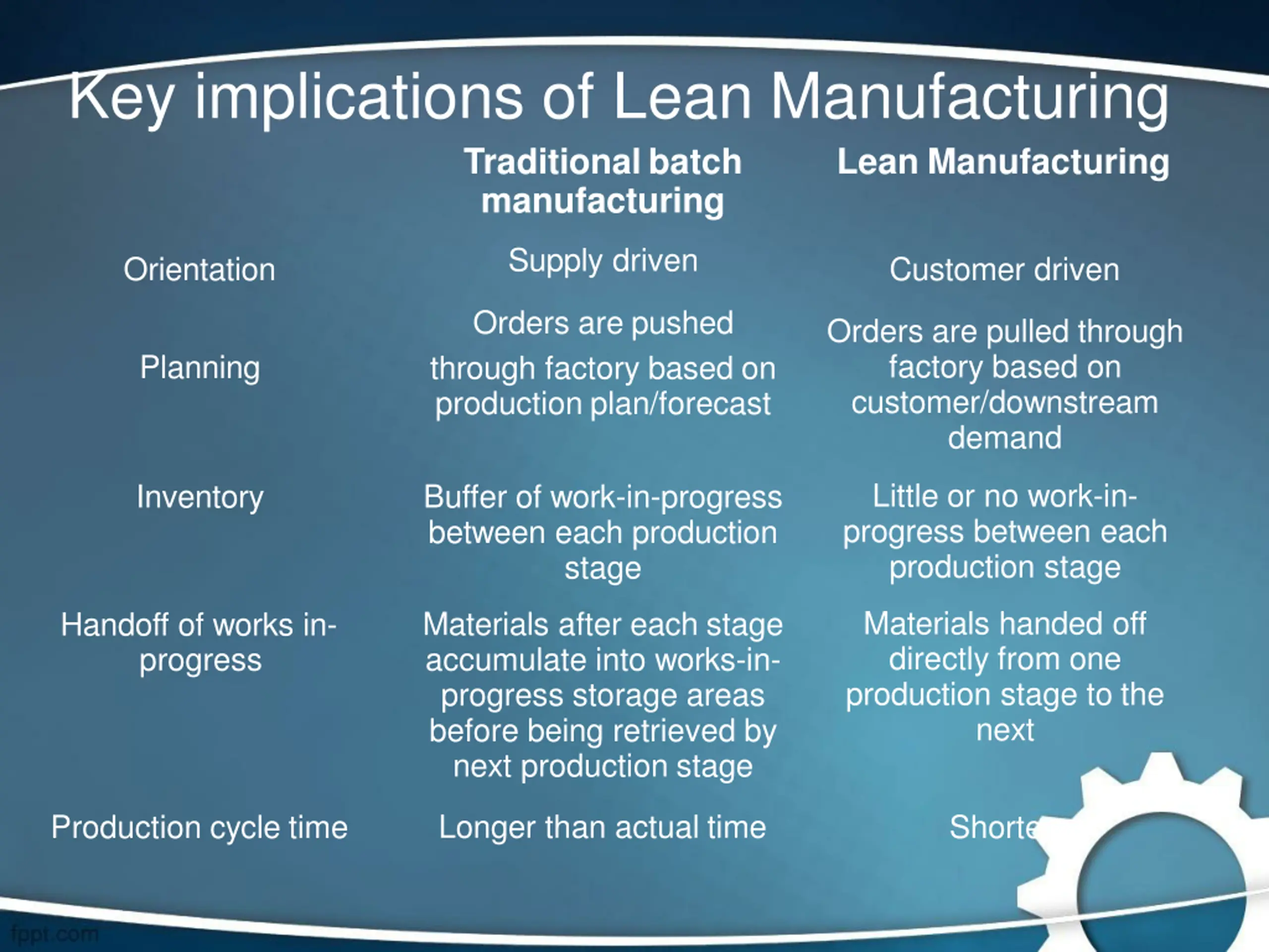 Key implications of Lean Manufacturing Traditional batch manufacturing Lean Manufacturing Supply driven Orientation Customer driven Orders are pushed through factory based on production plan/forecast Orders are pulled through factory based on customer/downstream demand Planning Little or no work-in- progress between each production stage Buffer of work-in-progress between each production stage Inventory Materials handed off directly from one production stage to the next Materials after each stage accumulate into works-in- progress storage areas before being retrieved by next production stage Handoff of works in- progress Longer than actual time Production cycle time Shorten