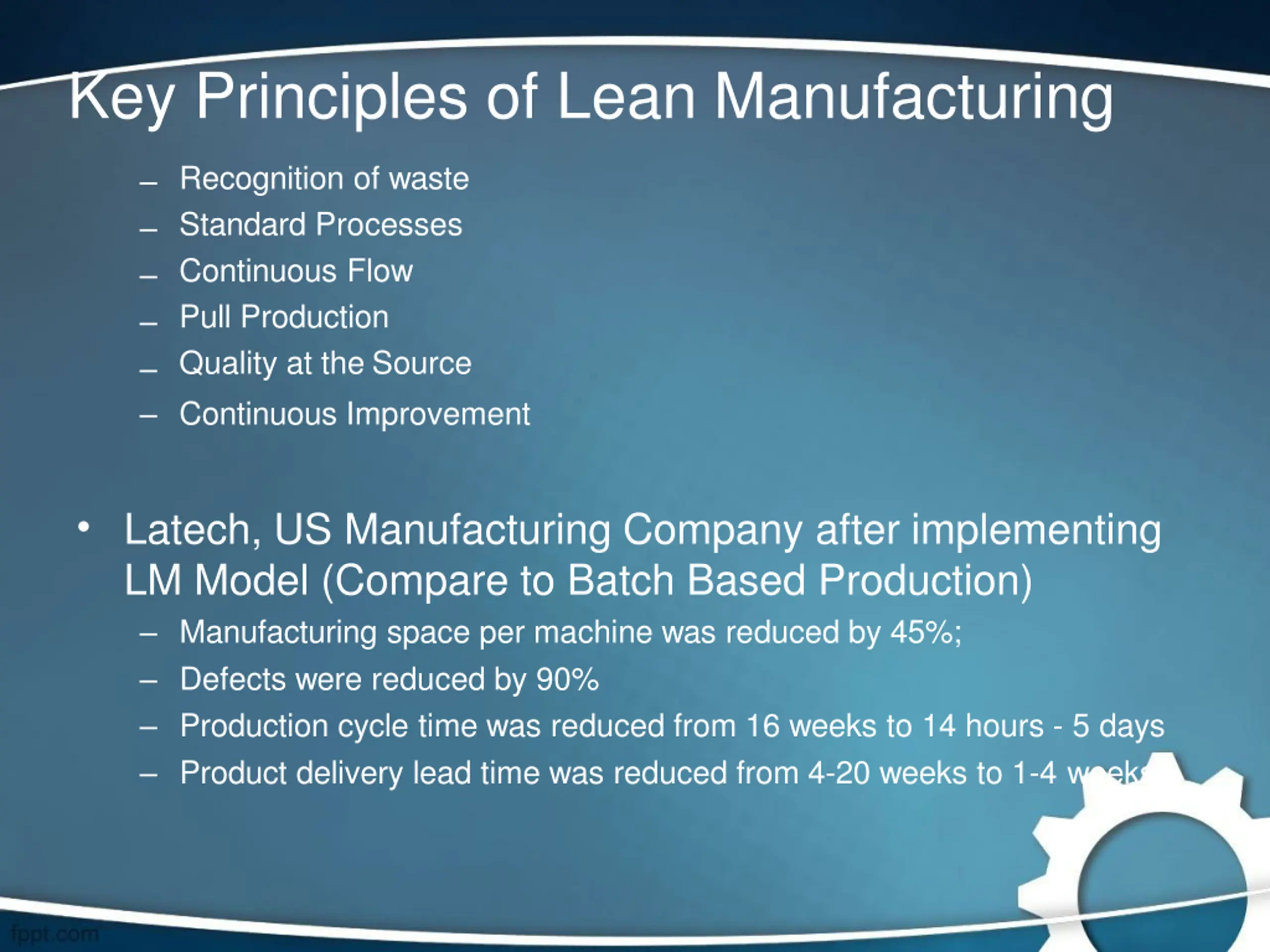 Key Principles of Lean Manufacturing Recognition of waste Standard Processes Continuous Flow Pull Production Quality at the Source Continuous Improvement Latech, US Manufacturing Company after implementing LM Model (Compare to Batch Based Production) Manufacturing space per machine was reduced by 45%; Defects were reduced by 90% Production cycle time was reduced from 16 weeks to 14 hours - 5 days Product delivery lead time was reduced from 4-20 weeks to 1-4 weeks.