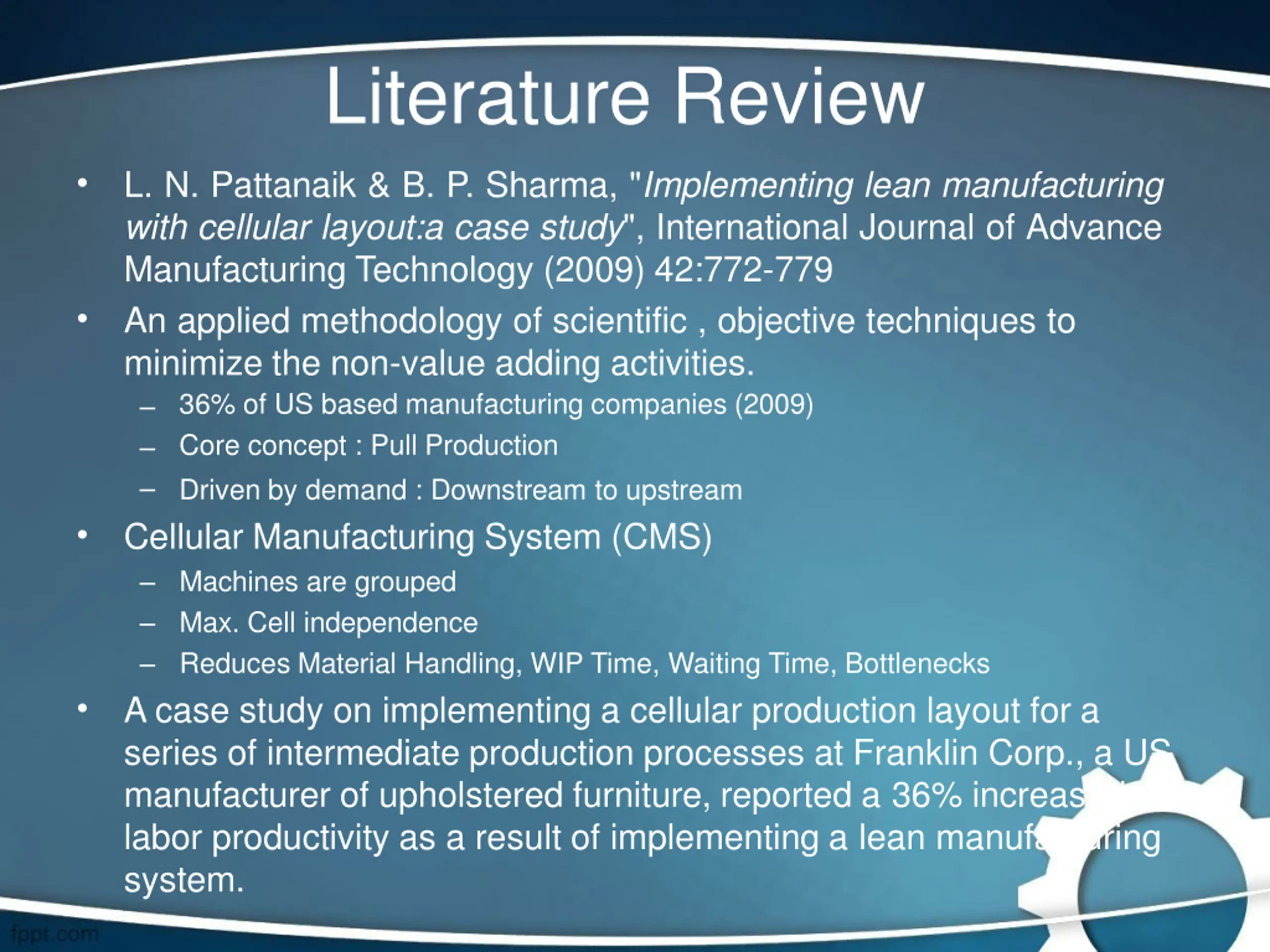 Literature Review L. N. Pattanaik & B. P. Sharma, "Implementing lean manufacturing with cellular layout:a case study", International Journal of Advance Manufacturing Technology (2009) 42:772-779 An applied methodology of scientific , objective techniques to minimize the non-value adding activities. Driven by demand : Downstream to upstream Cellular Manufacturing System (CMS) Machines are grouped Max. Cell independence Reduces Material Handling, WIP Time, Waiting Time, Bottlenecks A case study on implementing a cellular production layout for a series of intermediate production processes at Franklin Corp., a US manufacturer of upholstered furniture, reported a 36% increas labor productivity as a result of implementing a lean manufa uring system. 36% of US based manufacturing companies (2009) Core concept : Pull Production in