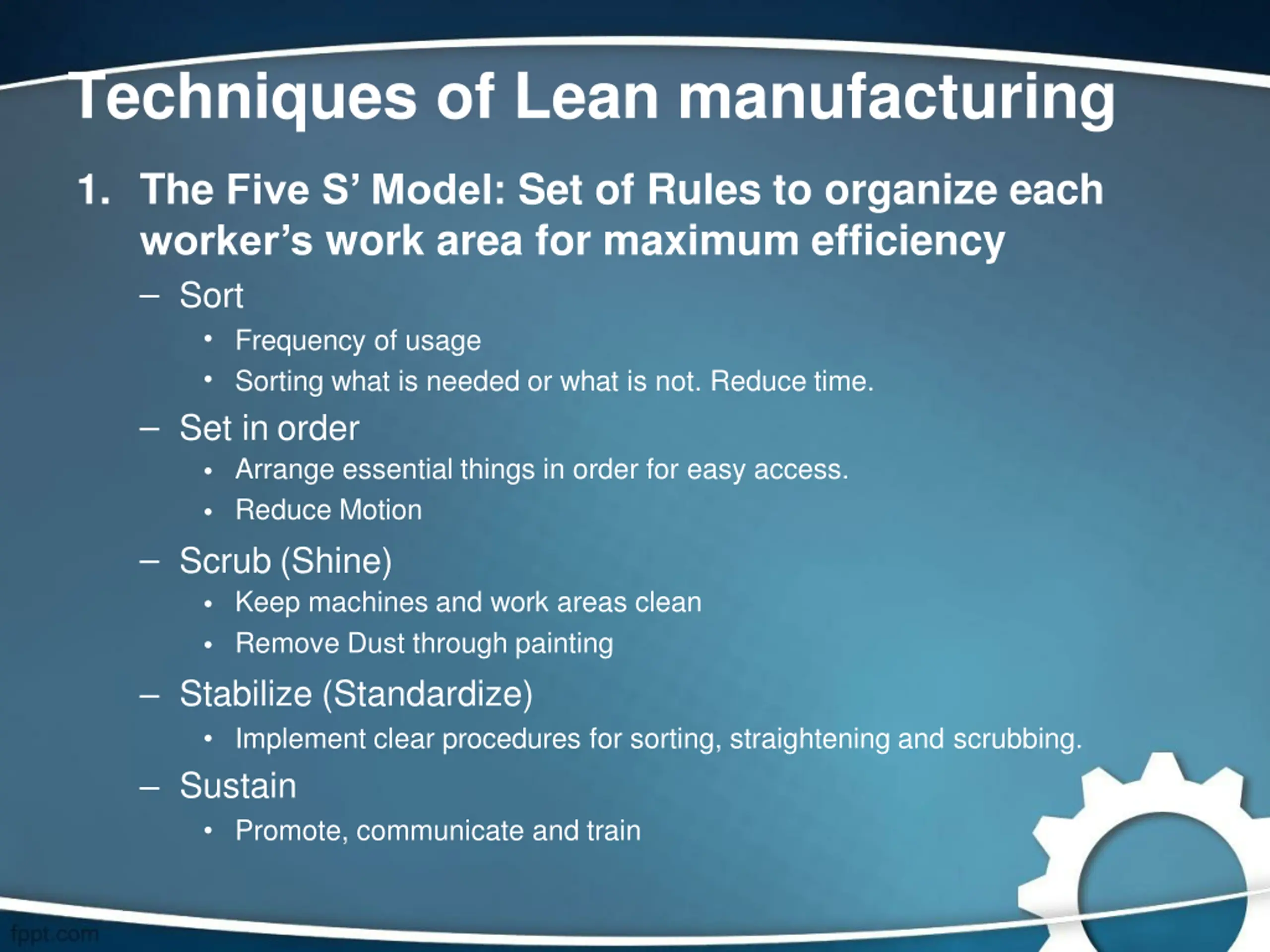 Techniques of Lean manufacturing 1. The Five S Model: Set of Rules to organize each worker s work area for maximum efficiency Sort Sorting what is needed or what is not. Reduce time. Set in order Reduce Motion Scrub (Shine) Remove Dust through painting Stabilize (Standardize) Implement clear procedures for sorting, straightening and scrubbing. Sustain Promote, communicate and train Frequency of usage Arrange essential things in order for easy access. Keep machines and work areas clean