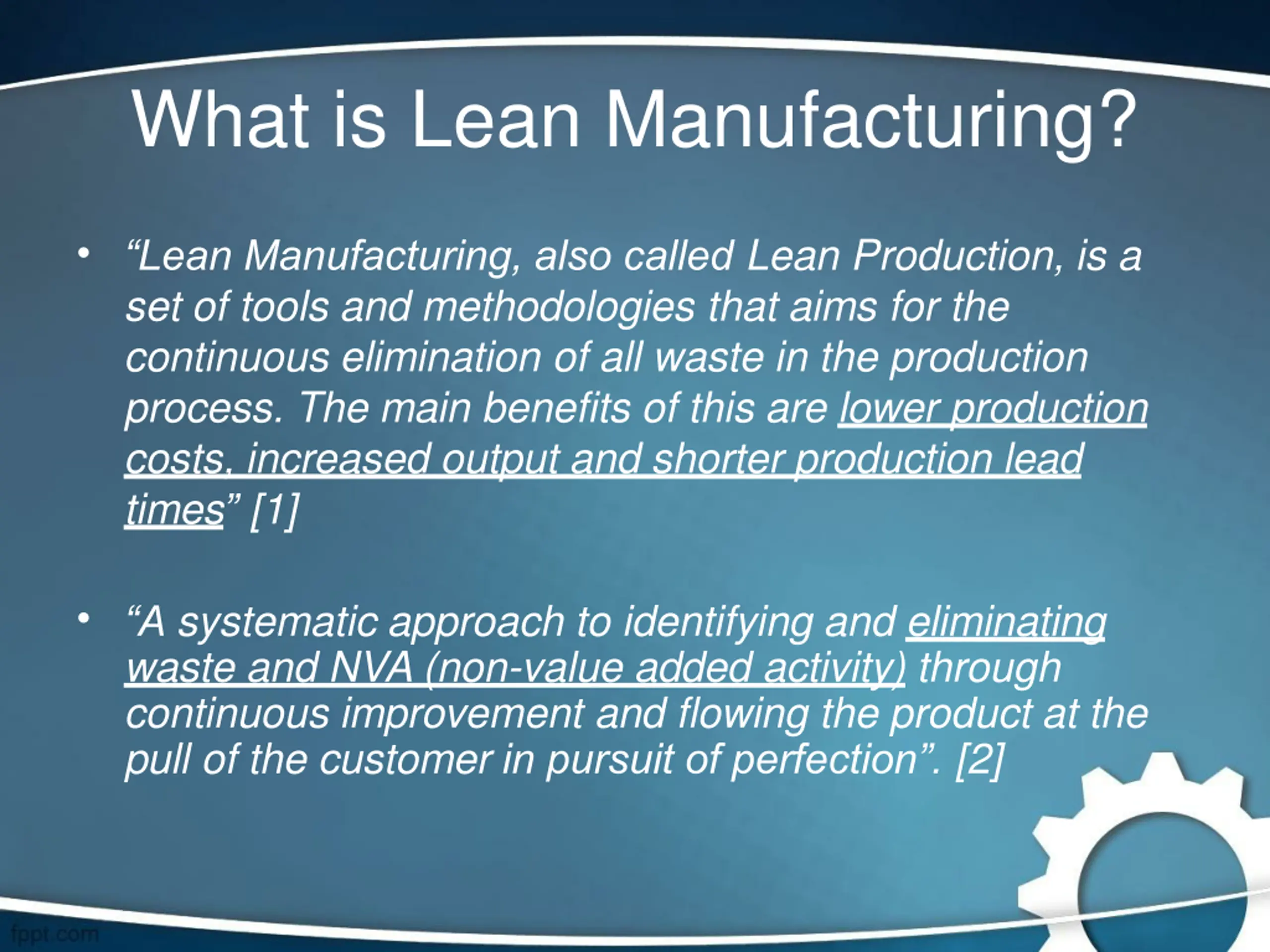 What is Lean Manufacturing? Lean Manufacturing, also called Lean Production, is a set of tools and methodologies that aims for the continuous elimination of all waste in the production process. The main benefits of this are lower production costs, increased output and shorter production lead times [1] A systematic approach to identifying and eliminating waste and NVA (non-value added activity) through continuous improvement and flowing the product at the pull of the customer in pursuit of perfection . [2]
