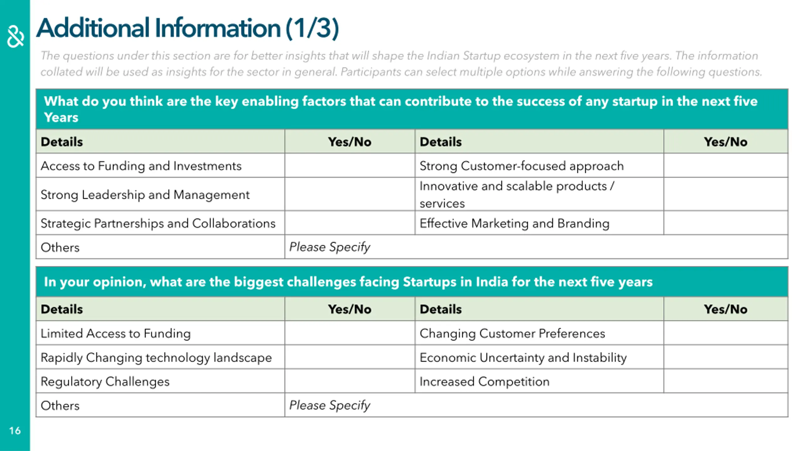 Additional Information (1/3) The questions under this section are for better insights that will shape the Indian Startup ecosystem in the next five years. The information collated will be used as insights for the sector in general. Participants can select multiple options while answering the following questions. What do you think are the key enabling factors that can contribute to the success of any startup in the next five Years Details Yes/No Details Yes/No Access to Funding and Investments Strong Customer-focused approach Innovative and scalable products / services Effective Marketing and Branding Strong Leadership and Management Strategic Partnerships and Collaborations Please Specify Others In your opinion, what are the biggest challenges facing Startups in India for the next five years Details Yes/No Details Yes/No Limited Access to Funding Changing Customer Preferences Rapidly Changing technology landscape Economic Uncertainty and Instability Regulatory Challenges Increased Competition Please Specify Others 16