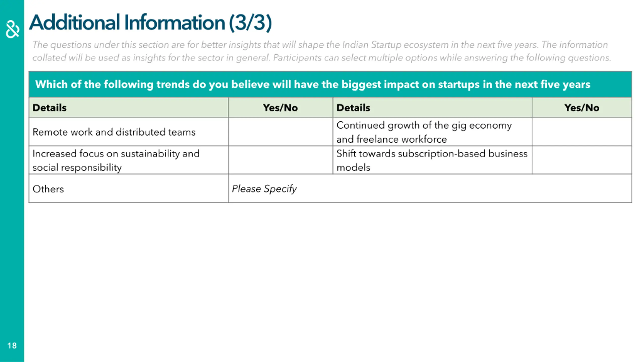 Additional Information (3/3) The questions under this section are for better insights that will shape the Indian Startup ecosystem in the next five years. The information collated will be used as insights for the sector in general. Participants can select multiple options while answering the following questions. Which of the following trends do you believe will have the biggest impact on startups in the next five years Details Yes/No Details Yes/No Continued growth of the gig economy and freelance workforce Shift towards subscription-based business models Remote work and distributed teams Increased focus on sustainability and social responsibility Please Specify Others 18