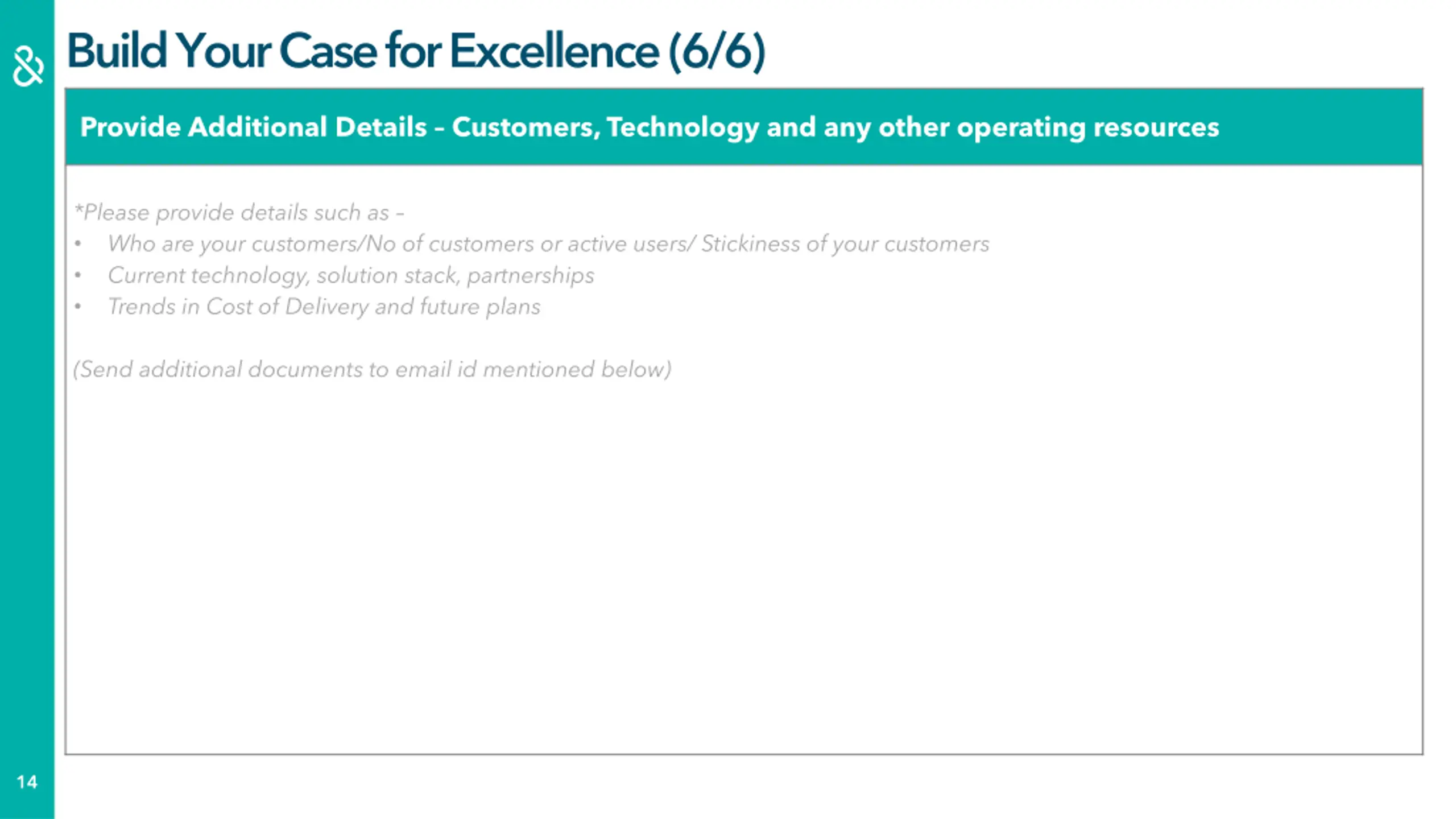 Build Your Case for Excellence (6/6) Provide Additional Details Customers, Technology and any other operating resources *Please provide details such as Who are your customers/No of customers or active users/ Stickiness of your customers Current technology, solution stack, partnerships Trends in Cost of Delivery and future plans (Send additional documents to email id mentioned below) 14