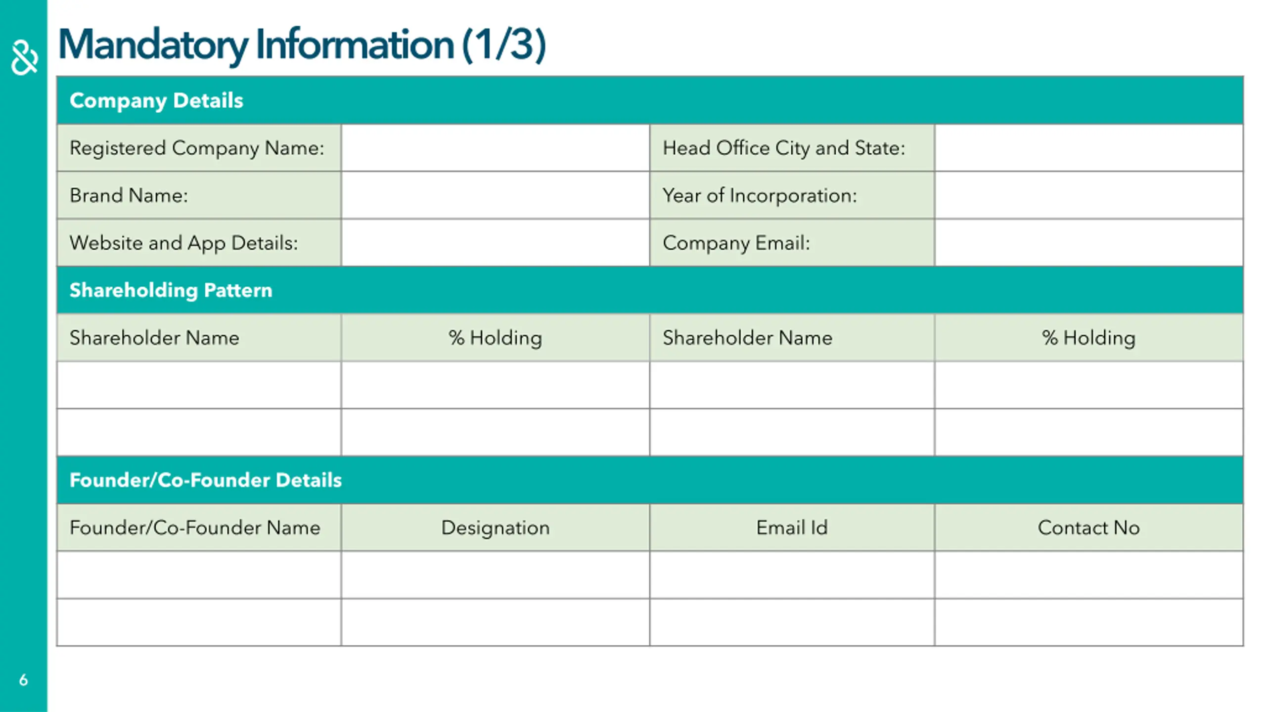 Mandatory Information (1/3) Company Details Registered Company Name: Head Office City and State: Brand Name: Year of Incorporation: Website and App Details: Company Email: Shareholding Pattern Shareholder Name % Holding Shareholder Name % Holding Founder/Co-Founder Details Founder/Co-Founder Name Designation Email Id Contact No 6