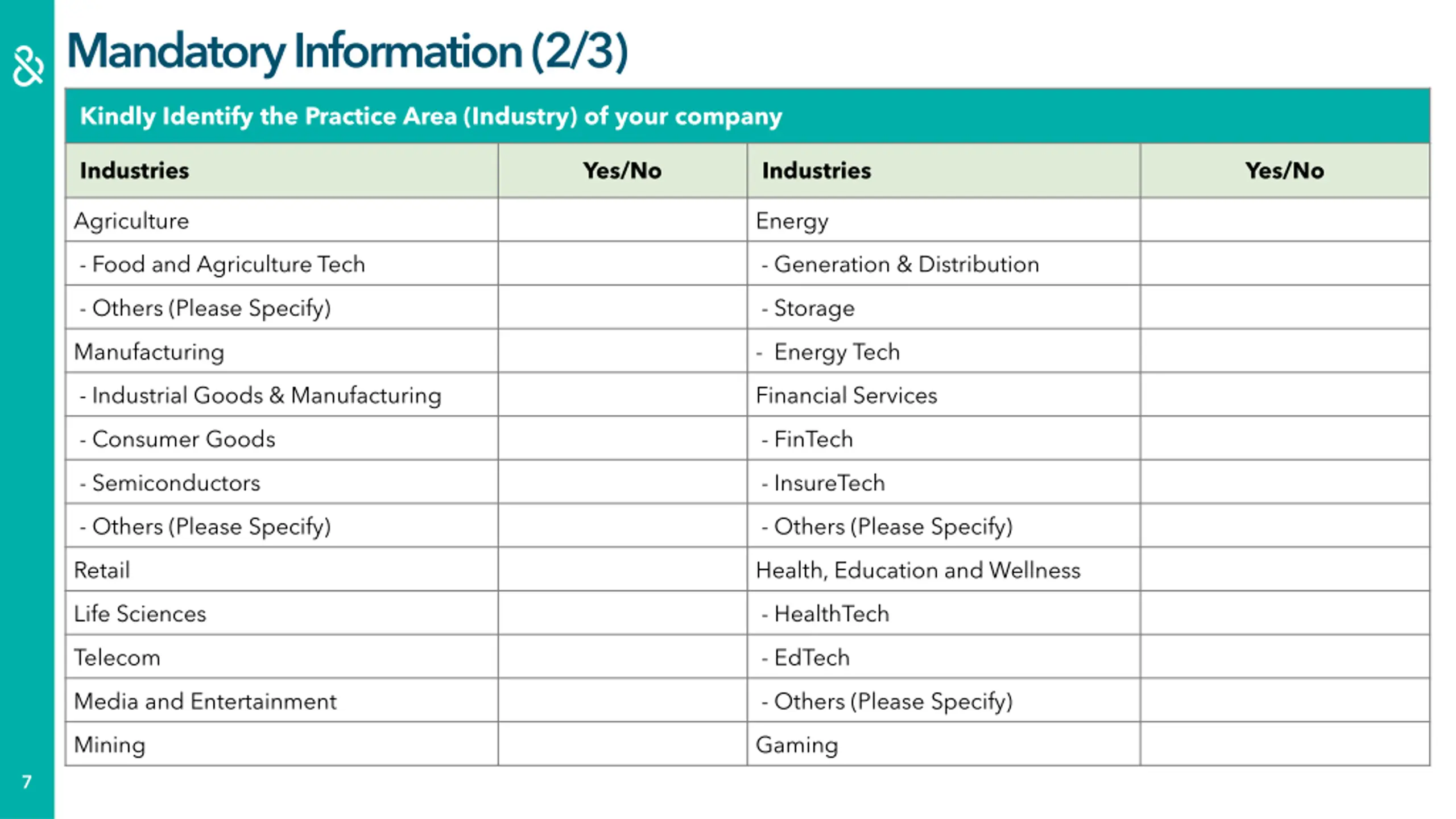 Mandatory Information (2/3) Kindly Identify the Practice Area (Industry) of your company Industries Yes/No Industries Yes/No Agriculture Energy - Food and Agriculture Tech - Generation & Distribution - Others (Please Specify) - Storage Manufacturing - Energy Tech - Industrial Goods & Manufacturing Financial Services - Consumer Goods - FinTech - Semiconductors - InsureTech - Others (Please Specify) - Others (Please Specify) Retail Health, Education and Wellness Life Sciences - HealthTech Telecom - EdTech Media and Entertainment - Others (Please Specify) Mining Gaming 7