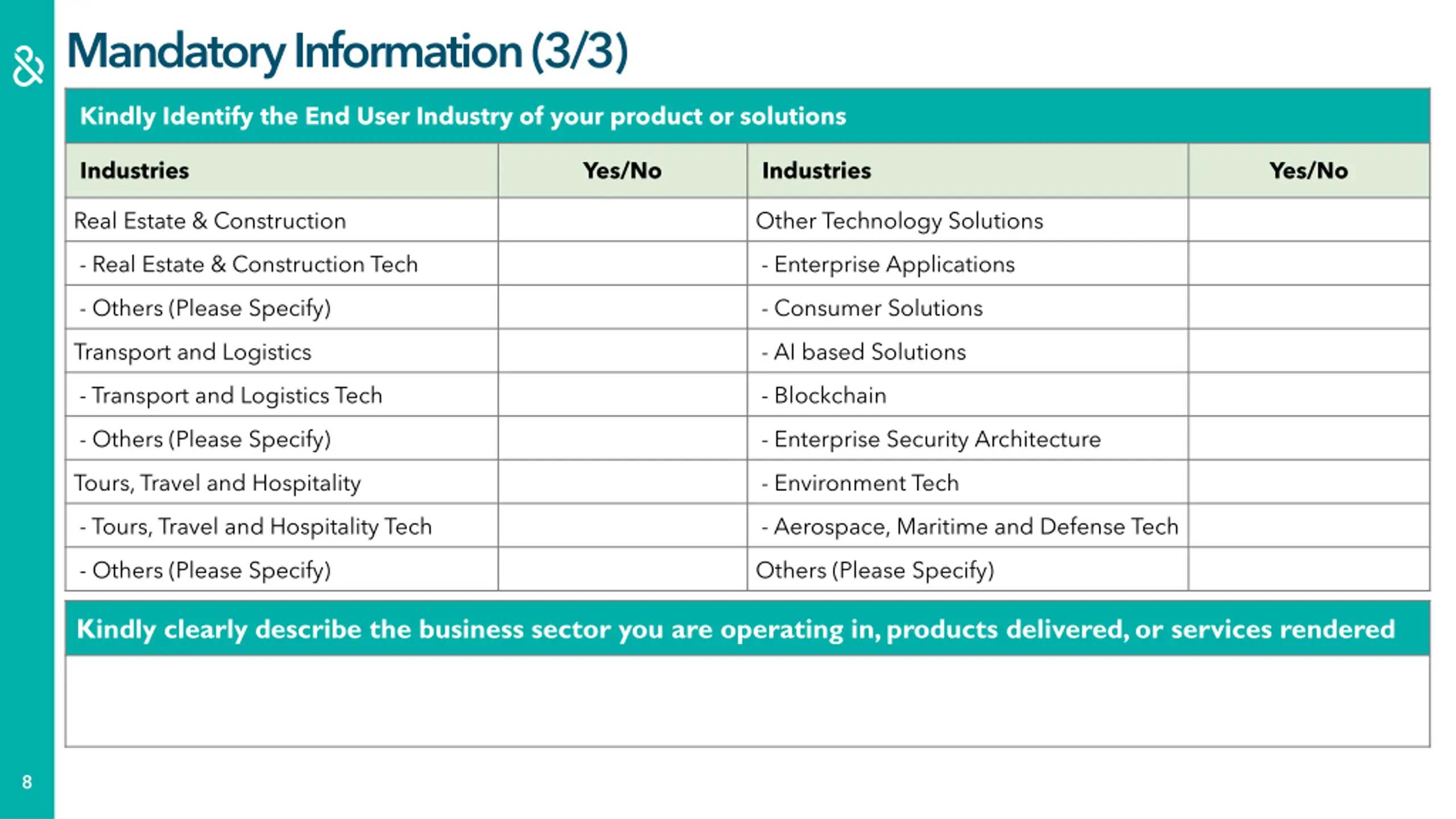Mandatory Information (3/3) Kindly Identify the End User Industry of your product or solutions Industries Yes/No Industries Yes/No Real Estate & Construction Other Technology Solutions - Real Estate & Construction Tech - Enterprise Applications - Others (Please Specify) - Consumer Solutions Transport and Logistics - AI based Solutions - Transport and Logistics Tech - Blockchain - Others (Please Specify) - Enterprise Security Architecture Tours, Travel and Hospitality - Environment Tech - Tours, Travel and Hospitality Tech - Aerospace, Maritime and Defense Tech - Others (Please Specify) Others (Please Specify) Kindly clearly describe the business sector you are operating in, products delivered, or services rendered 8