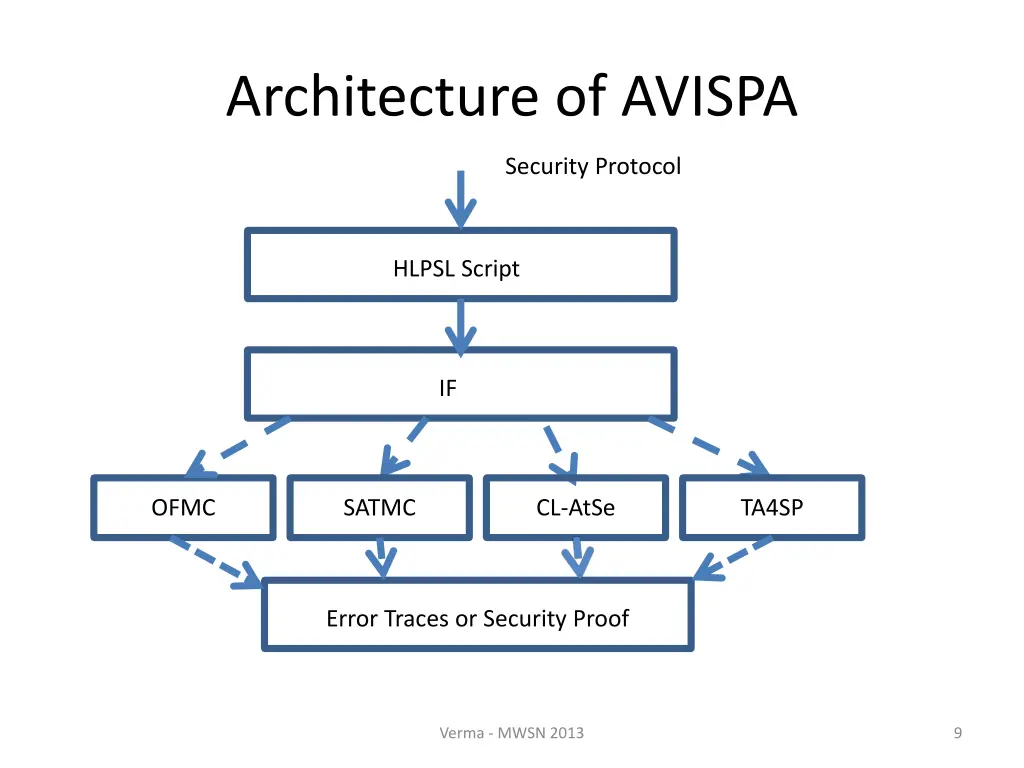 AVISPA AVISPA = Automated Validation of Internet Security Protocols and Applications Set of applications for building formal models of security protocols & formally analyzing their security properties. Provides: High Level Protocol Specification Language (HLPSL) for specifying protocols and their security properties. Provides: Formal verification tools Verma - MWSN 2013 8