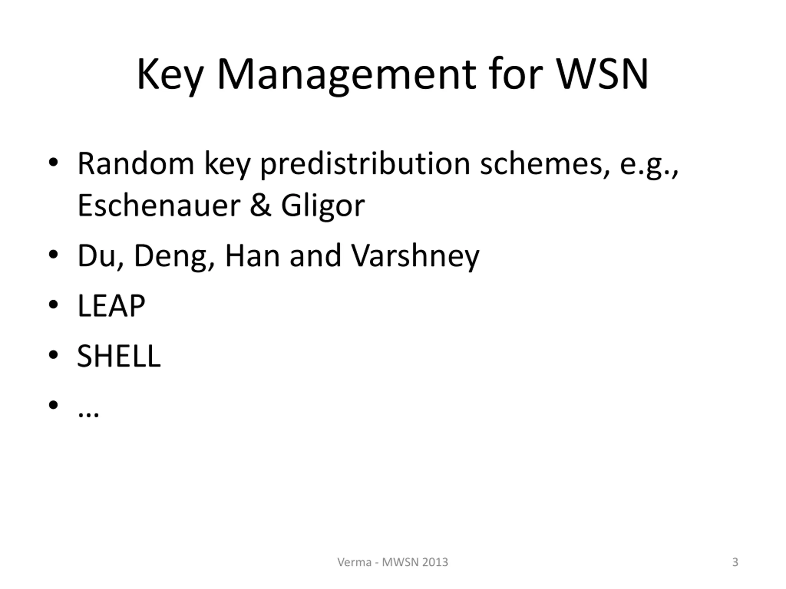 Key Management for WSN Random key predistribution schemes, e.g., Eschenauer & Gligor Du, Deng, Han and Varshney LEAP SHELL Verma - MWSN 2013 3