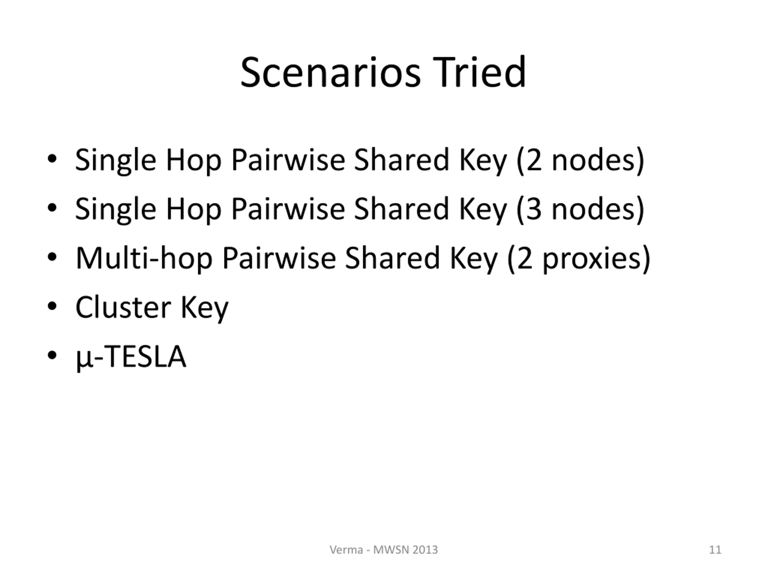 Scenarios Tried Single Hop Pairwise Shared Key (2 nodes) Single Hop Pairwise Shared Key (3 nodes) Multi-hop Pairwise Shared Key (2 proxies) Cluster Key -TESLA Verma - MWSN 2013 11