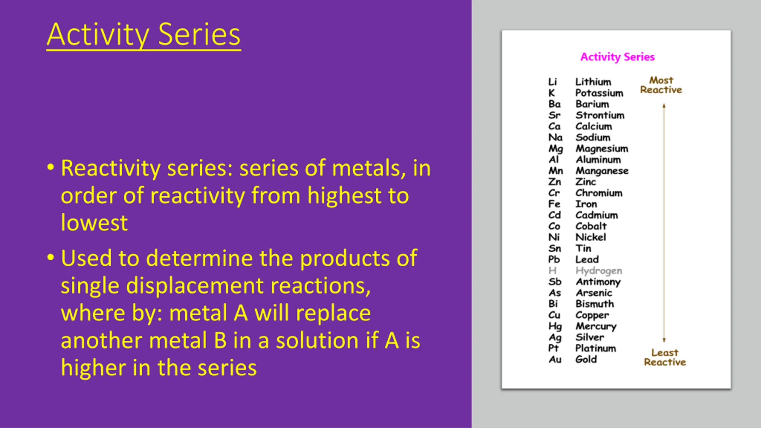 Activity Series Reactivity series: series of metals, in order of reactivity from highest to lowest Used to determine the products of single displacement reactions, where by: metal A will replace another metal B in a solution if A is higher in the series