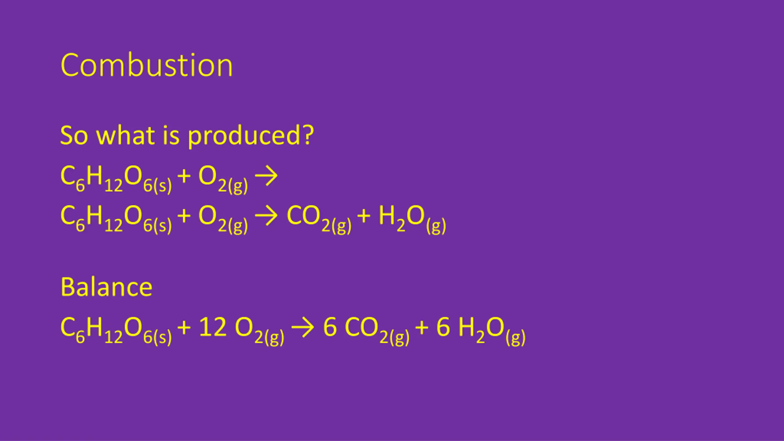 Combustion So what is produced? C6H12O6(s) + O2(g) C6H12O6(s) + O2(g) CO2(g) + H2O(g) Balance C6H12O6(s) + 12 O2(g) 6 CO2(g) + 6 H2O(g)
