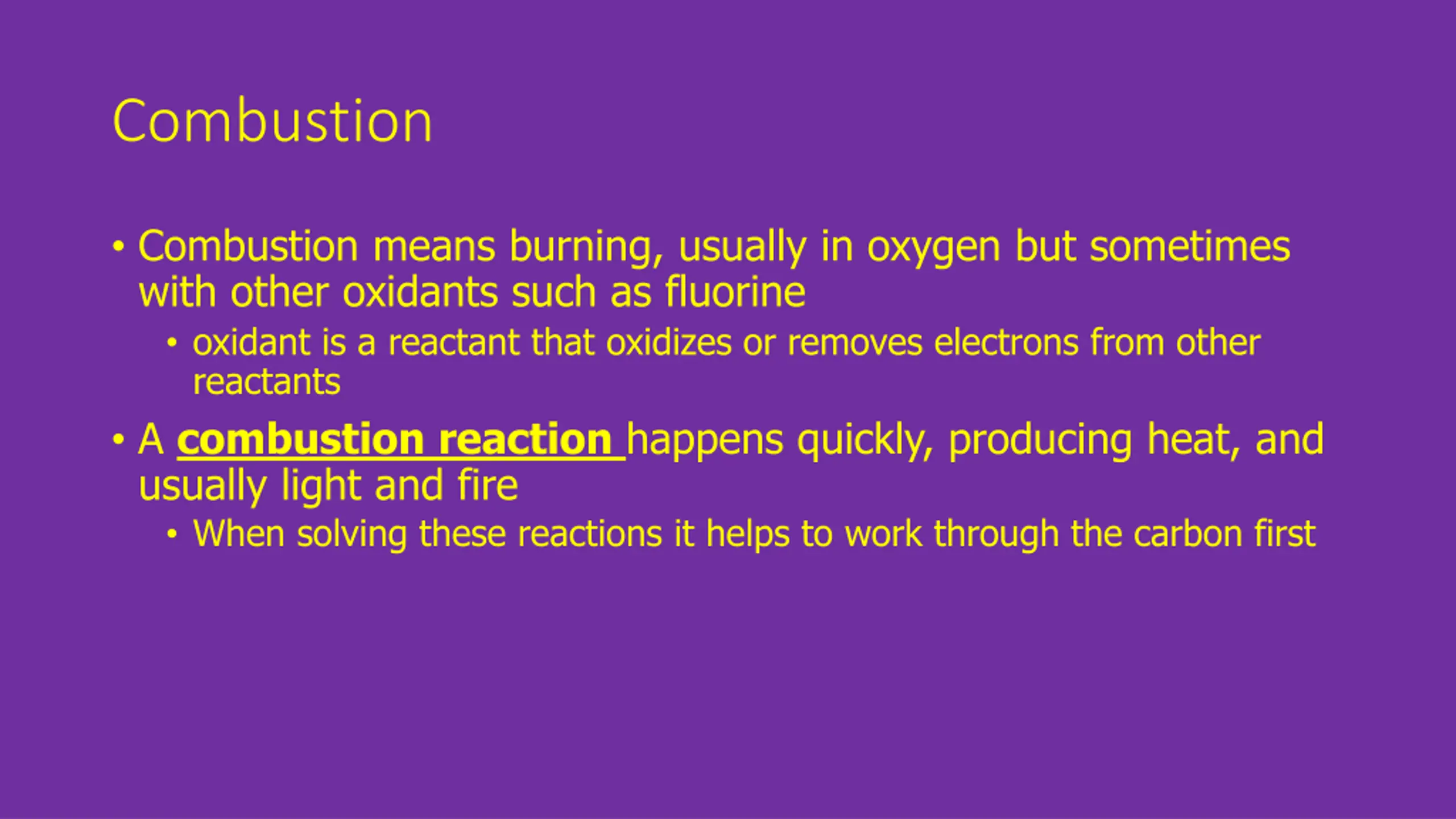 Combustion Combustion means burning, usually in oxygen but sometimes with other oxidants such as fluorine oxidant is a reactant that oxidizes or removes electrons from other reactants A combustion reaction happens quickly, producing heat, and usually light and fire When solving these reactions it helps to work through the carbon first
