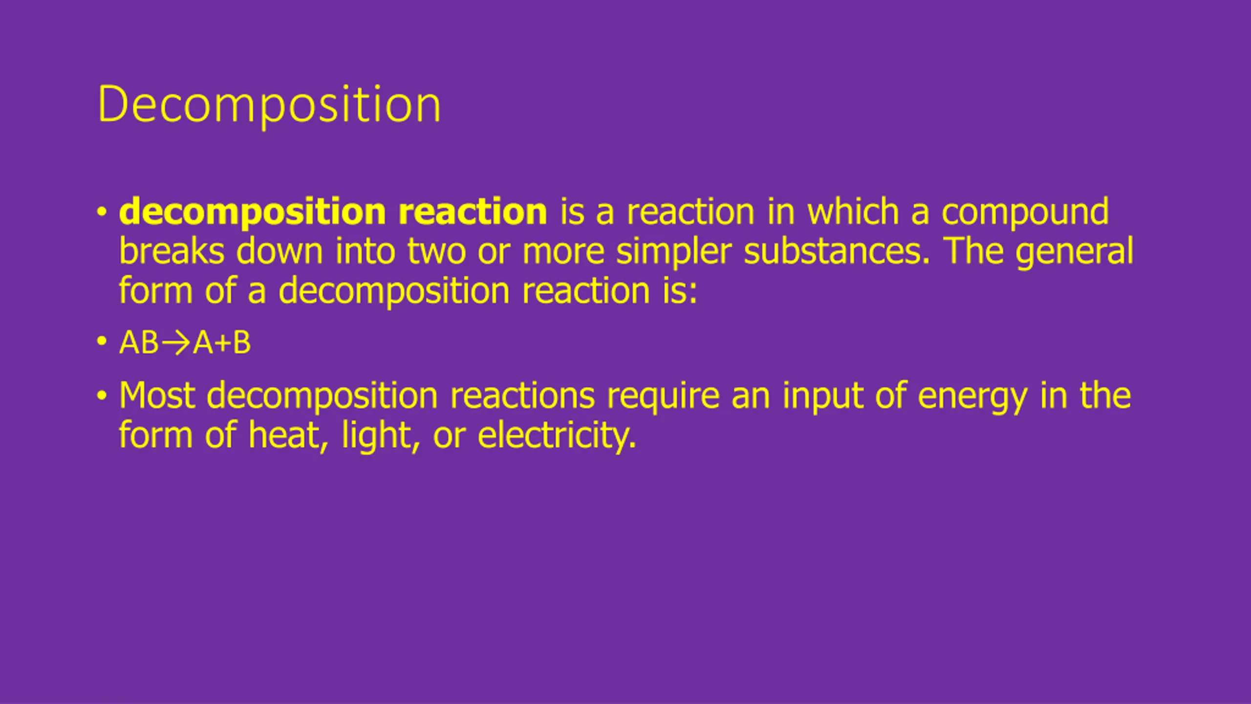 Decomposition decomposition reaction is a reaction in which a compound breaks down into two or more simpler substances. The general form of a decomposition reaction is: AB A+B Most decomposition reactions require an input of energy in the form of heat, light, or electricity.