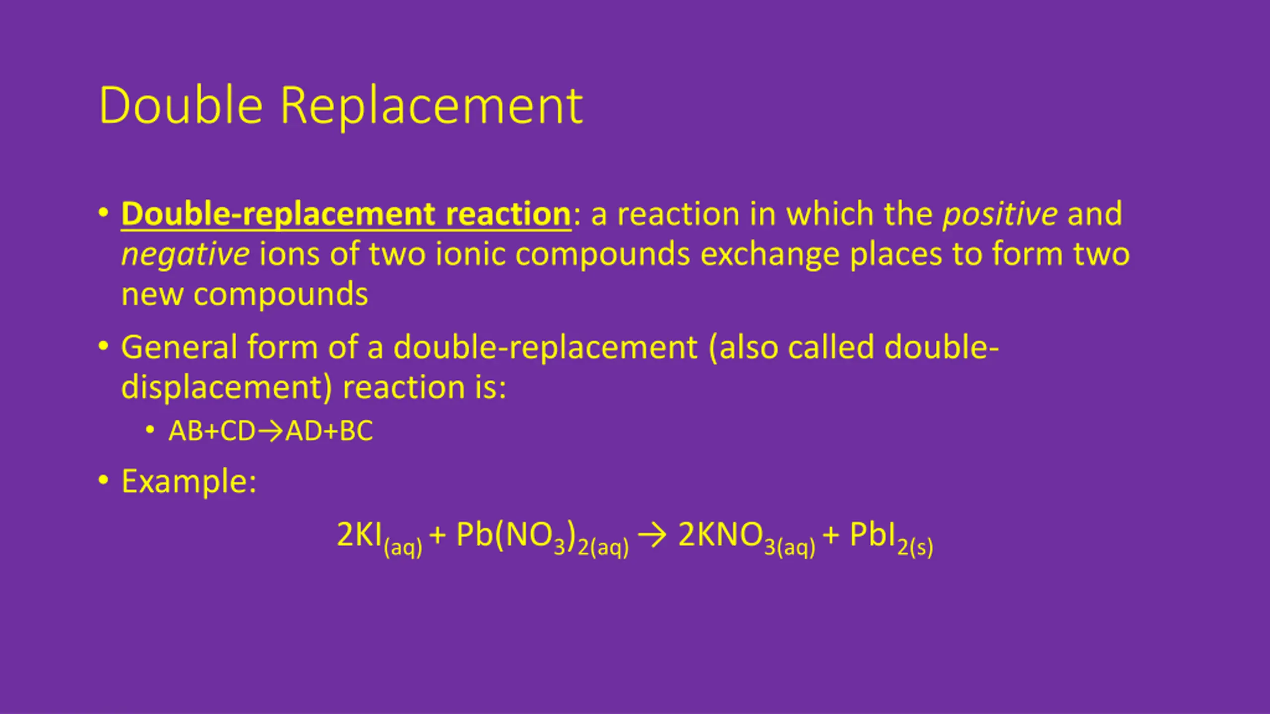 Double Replacement Double-replacement reaction: a reaction in which the positive and negative ions of two ionic compounds exchange places to form two new compounds General form of a double-replacement (also called double- displacement) reaction is: AB+CD AD+BC Example: 2KI(aq) + Pb(NO3)2(aq) 2KNO3(aq) + PbI2(s)