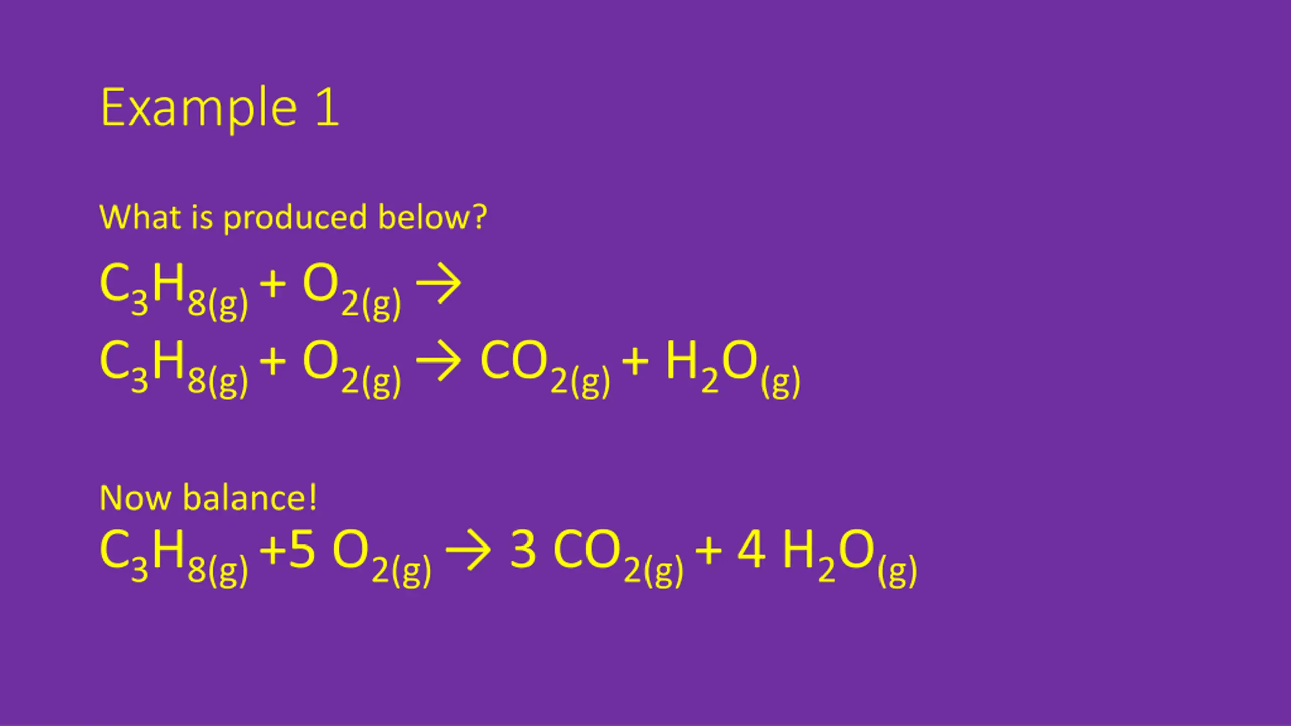 Example 1 What is produced below? C3H8(g) + O2(g) C3H8(g) + O2(g) CO2(g) + H2O(g) Now balance! C3H8(g) +5 O2(g) 3 CO2(g) + 4 H2O(g)