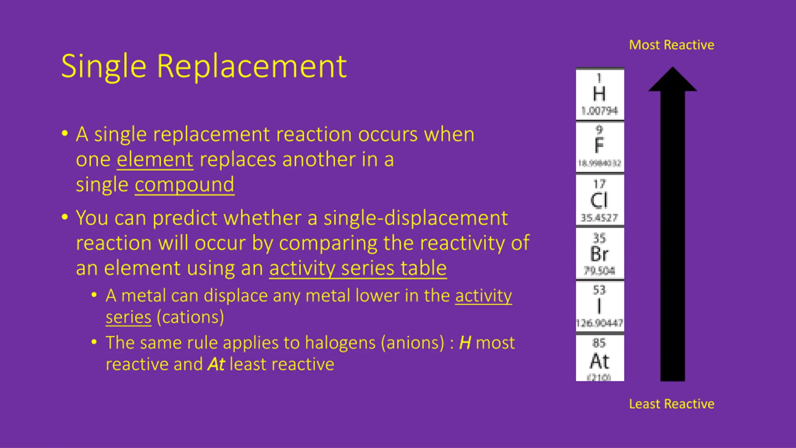 Most Reactive Single Replacement A single replacement reaction occurs when one element replaces another in a single compound You can predict whether a single-displacement reaction will occur by comparing the reactivity of an element using an activity series table A metal can displace any metal lower in the activity series (cations) The same rule applies to halogens (anions) : H H most reactive and At At least reactive Least Reactive