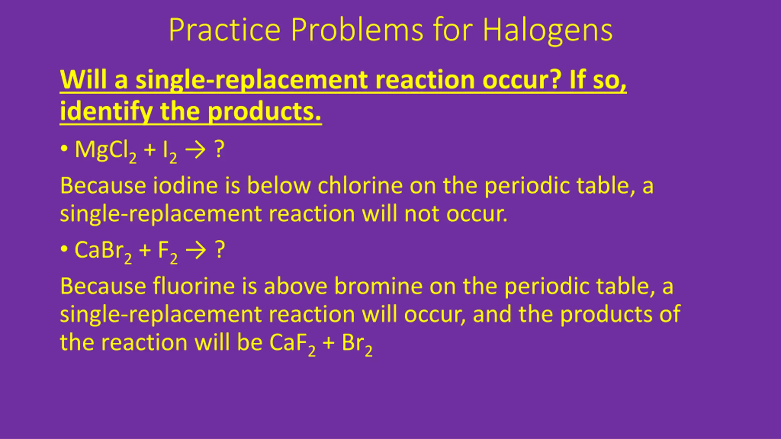 Practice Problems for Halogens Will a single-replacement reaction occur? If so, identify the products. MgCl2 + I2 ? Because iodine is below chlorine on the periodic table, a single-replacement reaction will not occur. CaBr2 + F2 ? Because fluorine is above bromine on the periodic table, a single-replacement reaction will occur, and the products of the reaction will be CaF2 + Br2