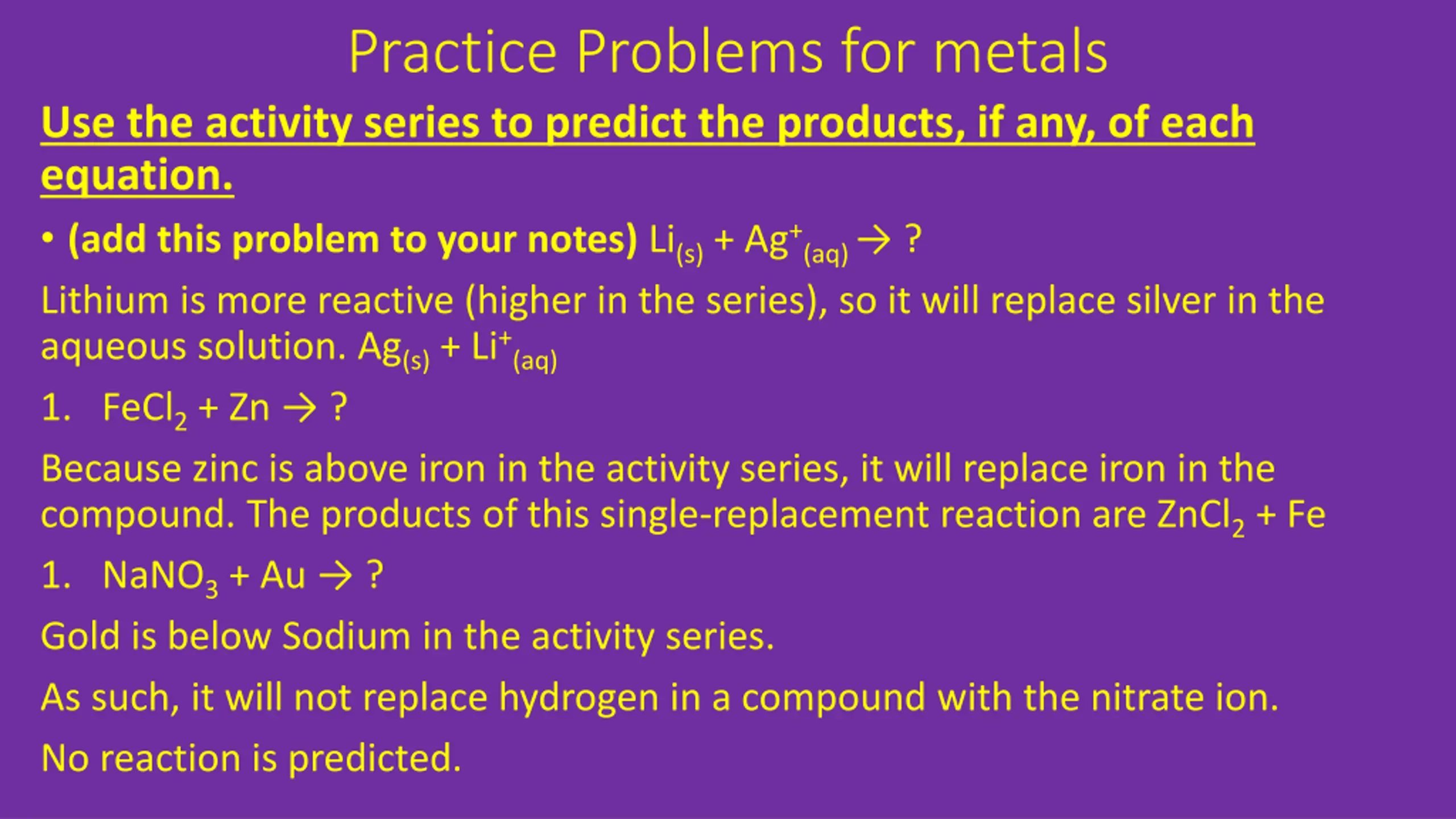 Practice Problems for metals Use the activity series to predict the products, if any, of each equation. (add this problem to your notes) Li(s)+ Ag+(aq) ? Lithium is more reactive (higher in the series), so it will replace silver in the aqueous solution. Ag(s) + Li+(aq) 1. FeCl2+ Zn ? Because zinc is above iron in the activity series, it will replace iron in the compound. The products of this single-replacement reaction are ZnCl2 + Fe 1. NaNO3+ Au ? Gold is below Sodium in the activity series. As such, it will not replace hydrogen in a compound with the nitrate ion. No reaction is predicted.