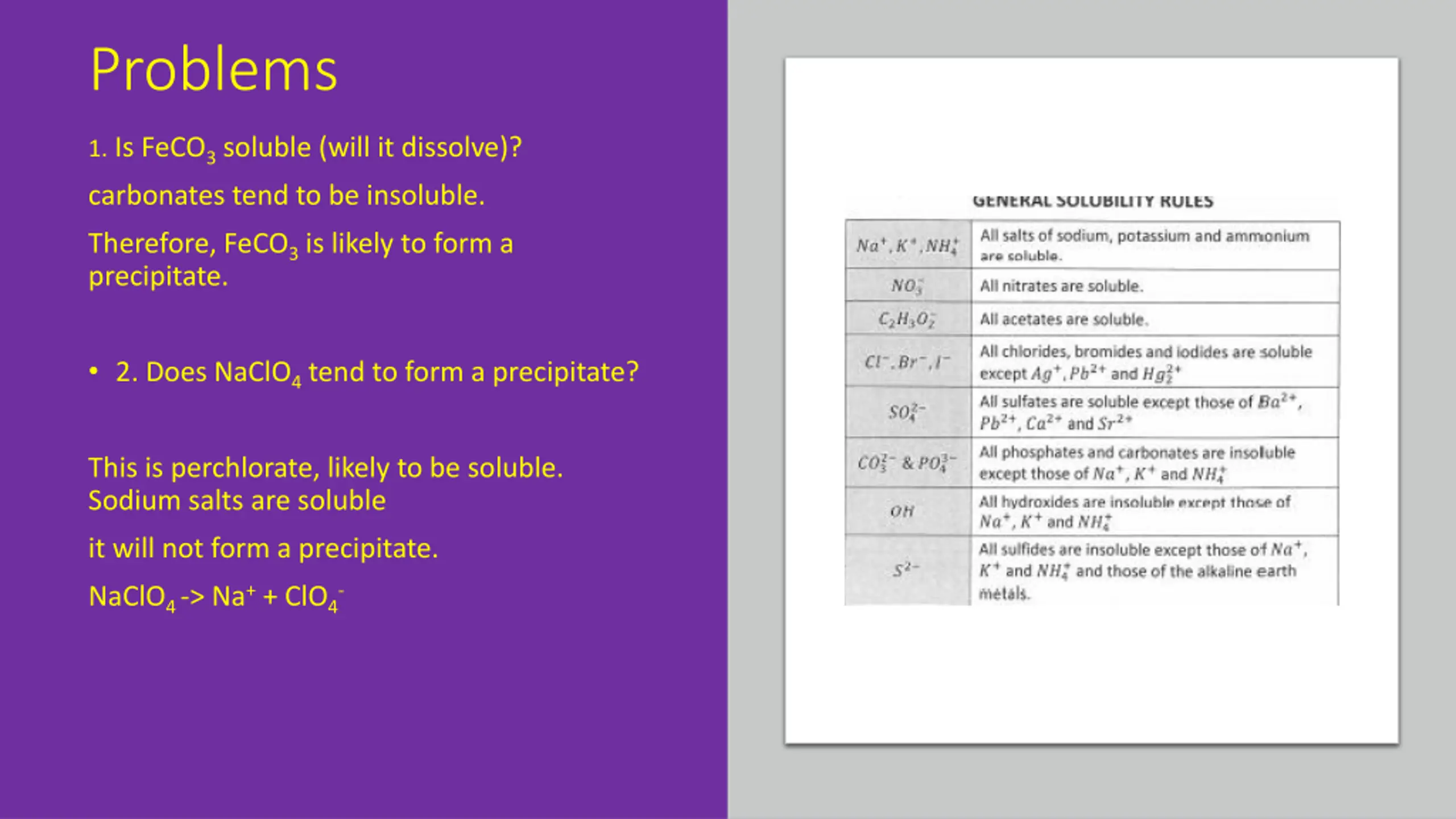 Problems 1. Is FeCO3 soluble (will it dissolve)? carbonates tend to be insoluble. Therefore, FeCO3 is likely to form a precipitate. 2. Does NaClO4 tend to form a precipitate? This is perchlorate, likely to be soluble. Sodium salts are soluble it will not form a precipitate. NaClO4 -> Na+ + ClO4-
