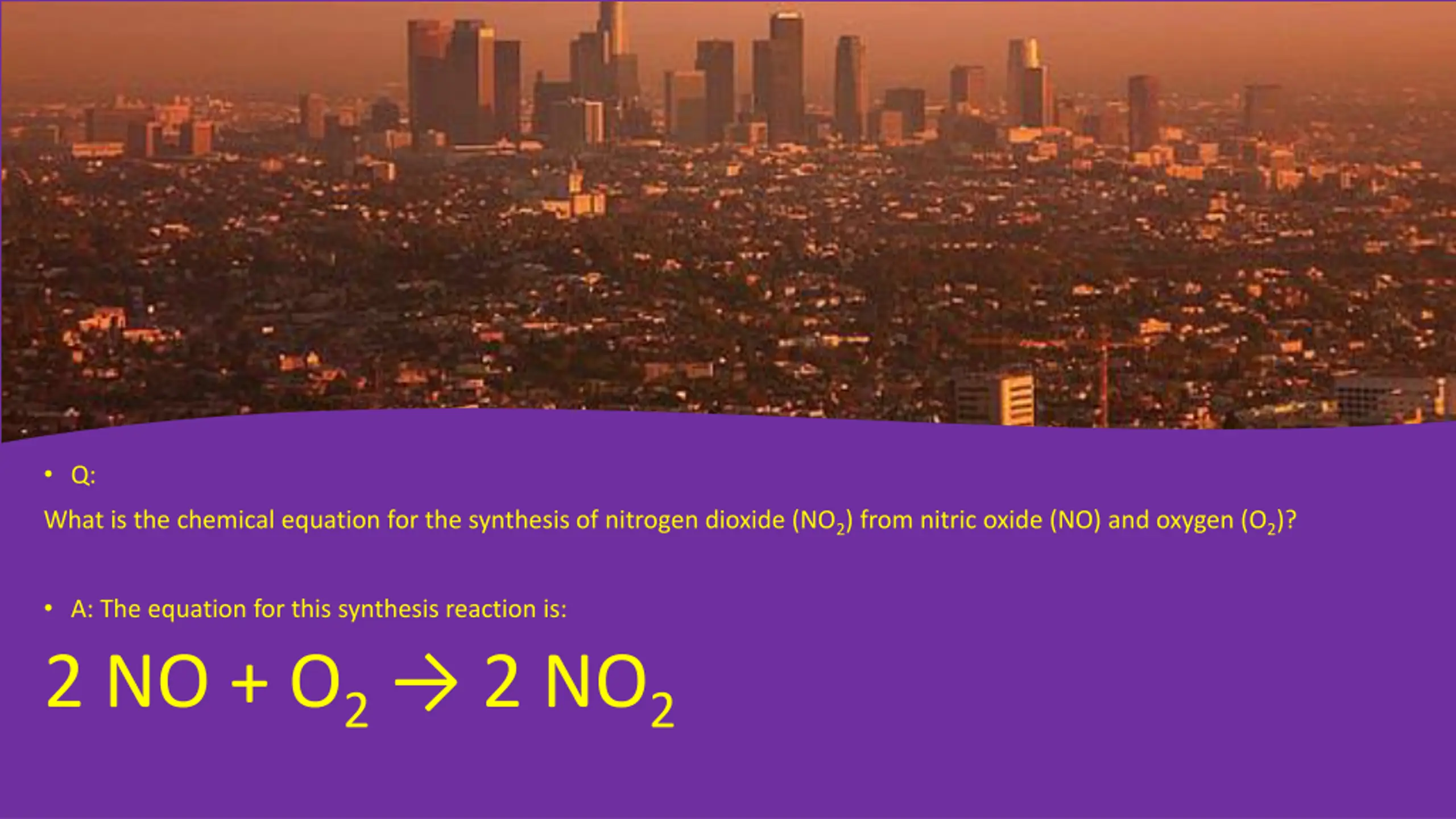 Q: What is the chemical equation for the synthesis of nitrogen dioxide (NO2) from nitric oxide (NO) and oxygen (O2)? A: The equation for this synthesis reaction is: 2 NO + O2 2 NO2