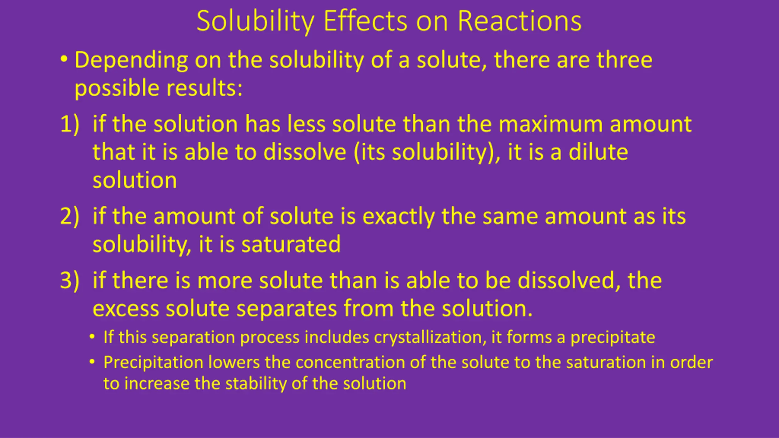 Solubility Effects on Reactions Depending on the solubility of a solute, there are three possible results: 1) if the solution has less solute than the maximum amount that it is able to dissolve (its solubility), it is a dilute solution 2) if the amount of solute is exactly the same amount as its solubility, it is saturated 3) if there is more solute than is able to be dissolved, the excess solute separates from the solution. If this separation process includes crystallization, it forms a precipitate Precipitation lowers the concentration of the solute to the saturation in order to increase the stability of the solution