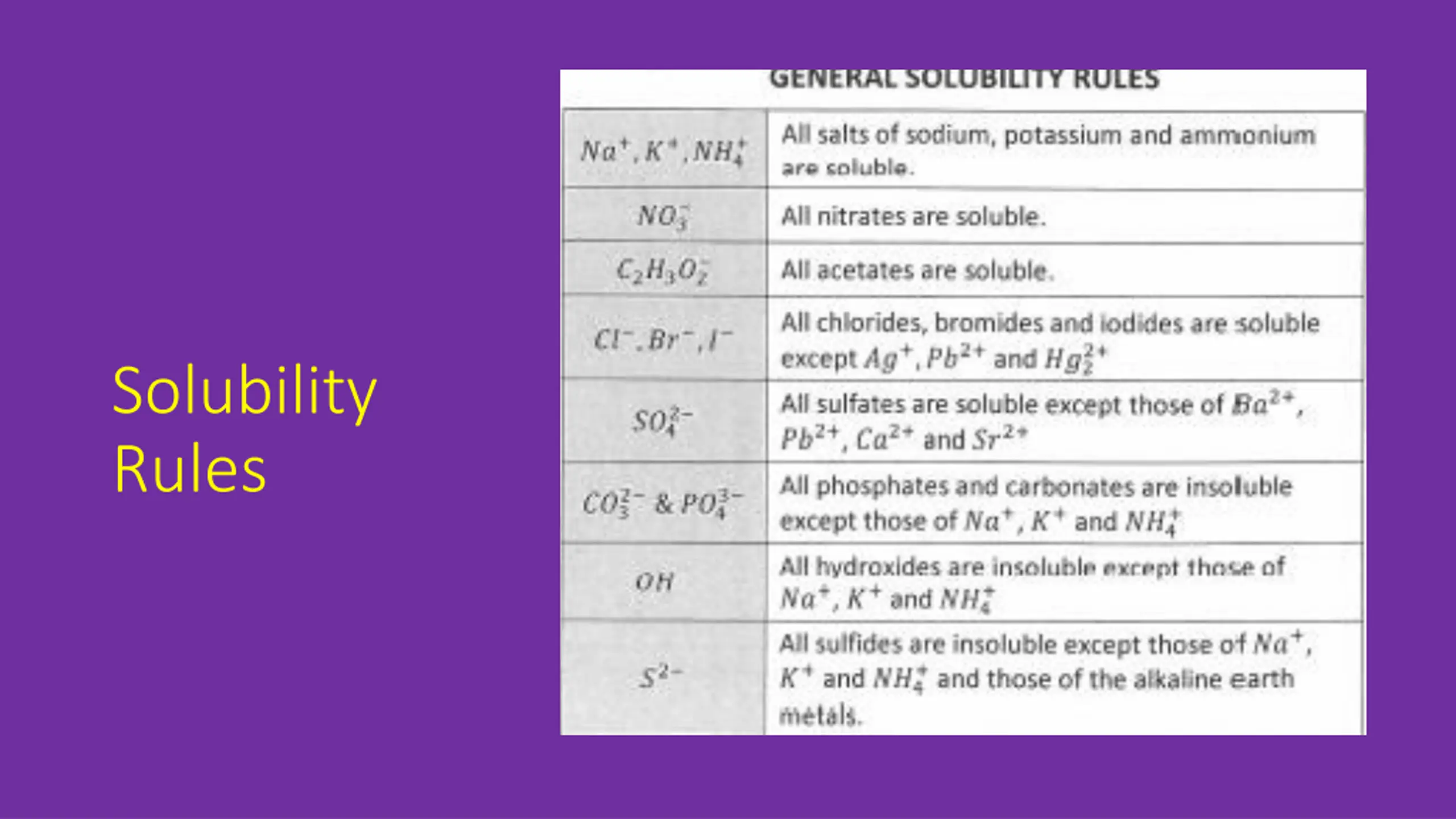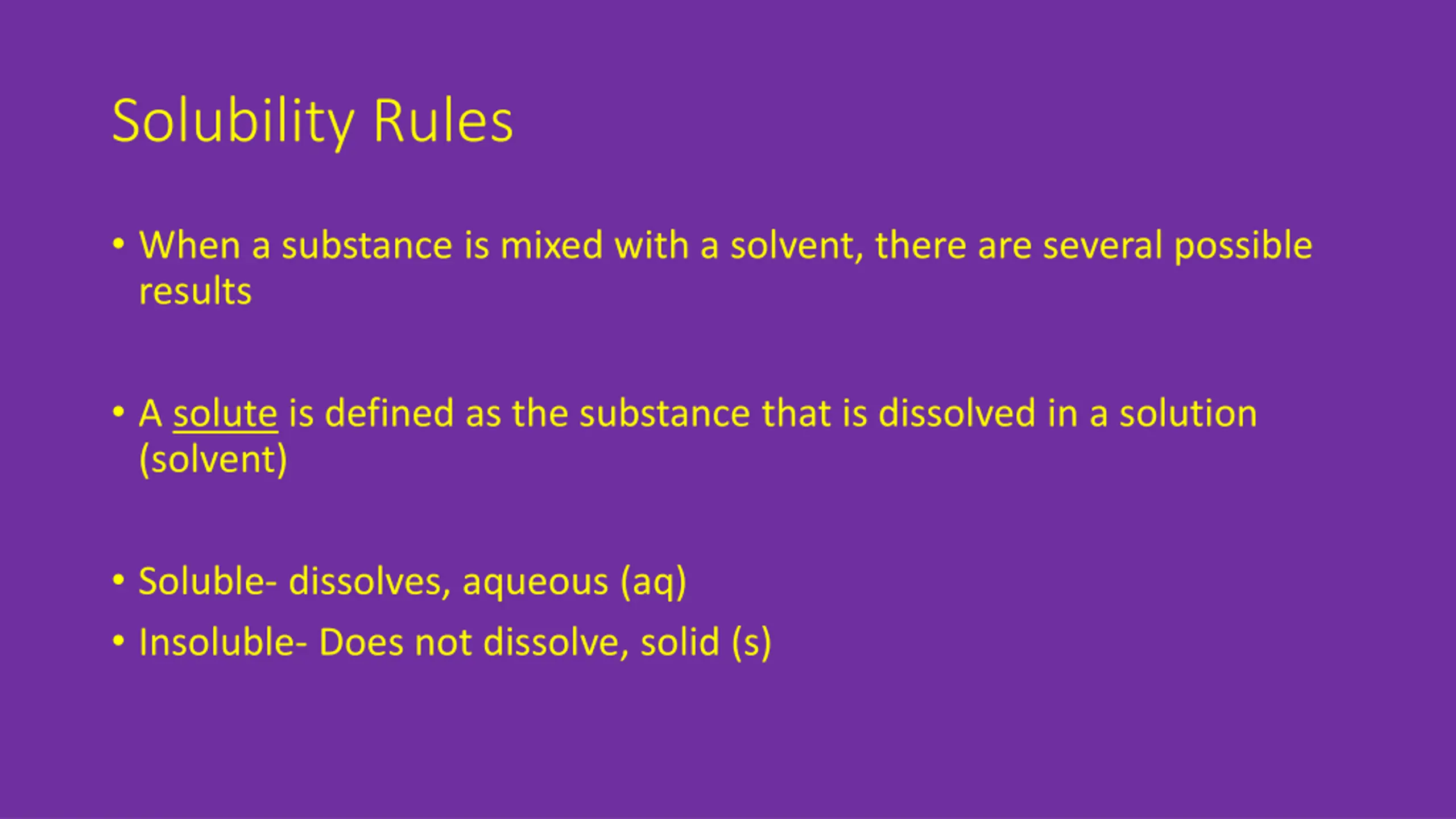 Solubility Rules When a substance is mixed with a solvent, there are several possible results A solute is defined as the substance that is dissolved in a solution (solvent) Soluble- dissolves, aqueous (aq) Insoluble- Does not dissolve, solid (s)