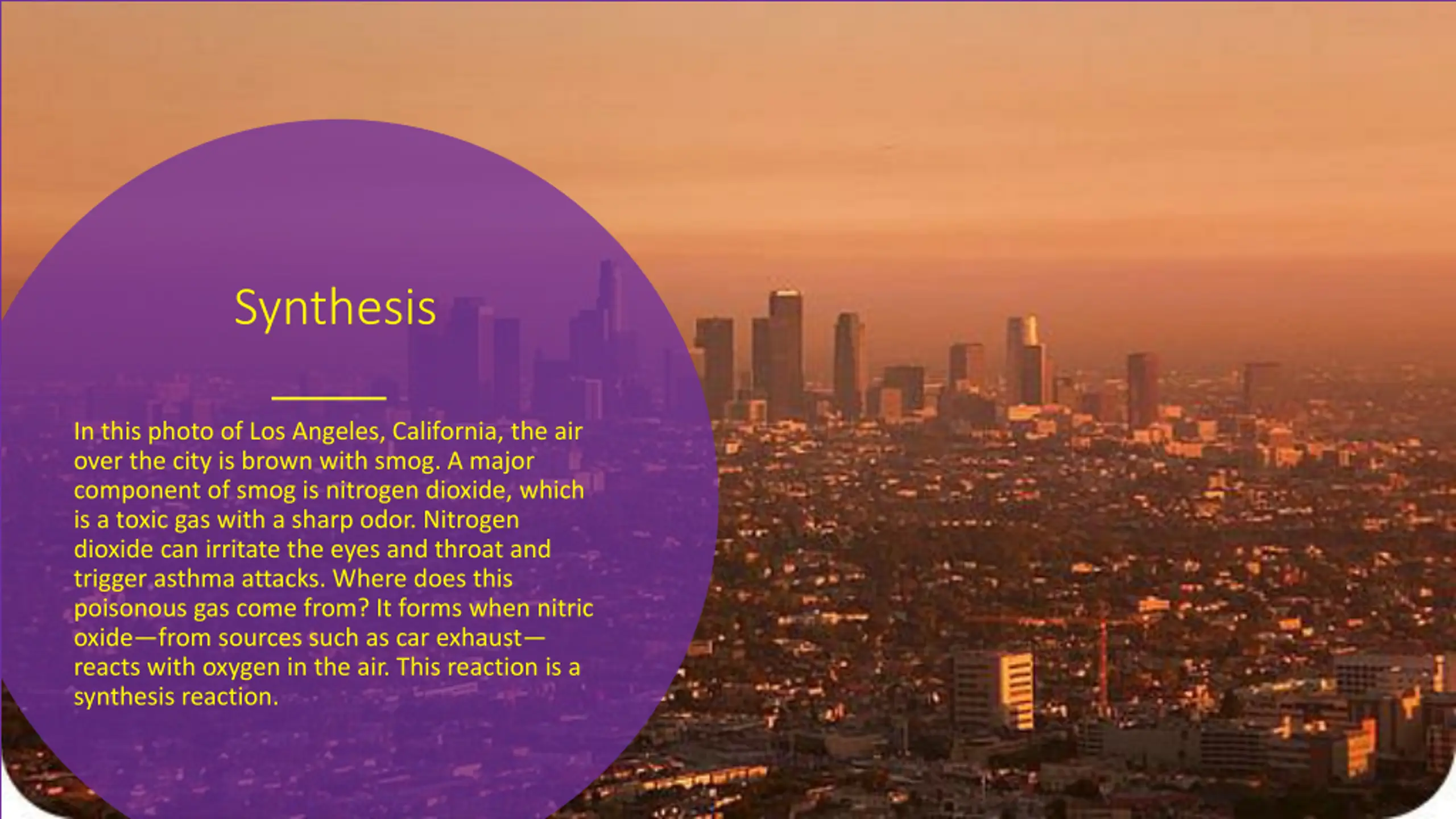 Synthesis In this photo of Los Angeles, California, the air over the city is brown with smog. A major component of smog is nitrogen dioxide, which is a toxic gas with a sharp odor. Nitrogen dioxide can irritate the eyes and throat and trigger asthma attacks. Where does this poisonous gas come from? It forms when nitric oxide from sources such as car exhaust reacts with oxygen in the air. This reaction is a synthesis reaction.