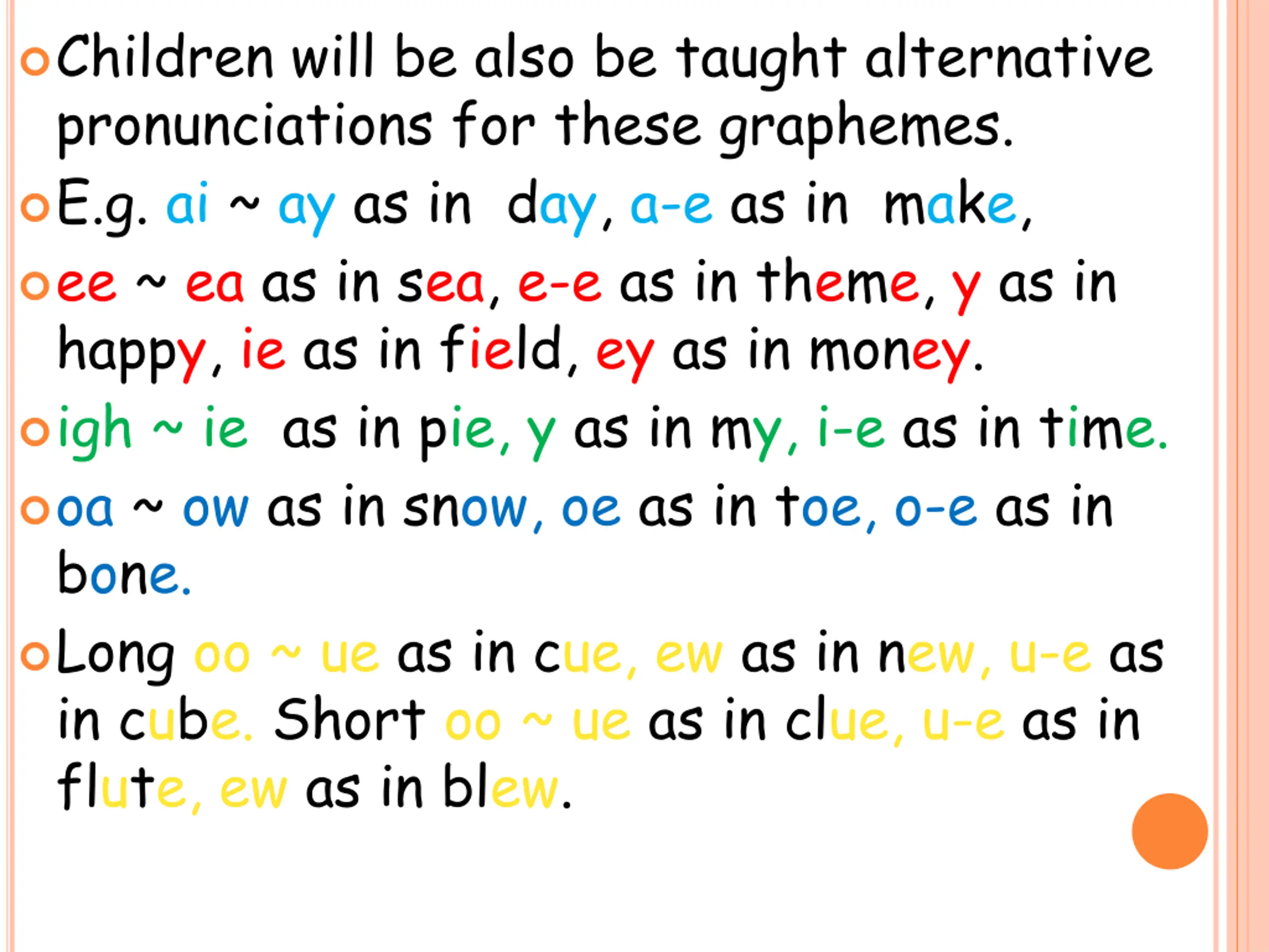 Children will be also be taught alternative pronunciations for these graphemes. E.g. ai ~ ay as in day, a-e as in make, ee ~ ea as in sea, e-e as in theme, y as in happy, ie as in field, ey as in money. igh ~ ie as in pie, y as in my, i-e as in time. oa ~ ow as in snow, oe as in toe, o-e as in bone. Long oo ~ ue as in cue, ew as in new, u-e as in cube. Short oo ~ ue as in clue, u-e as in flute, ew as in blew.