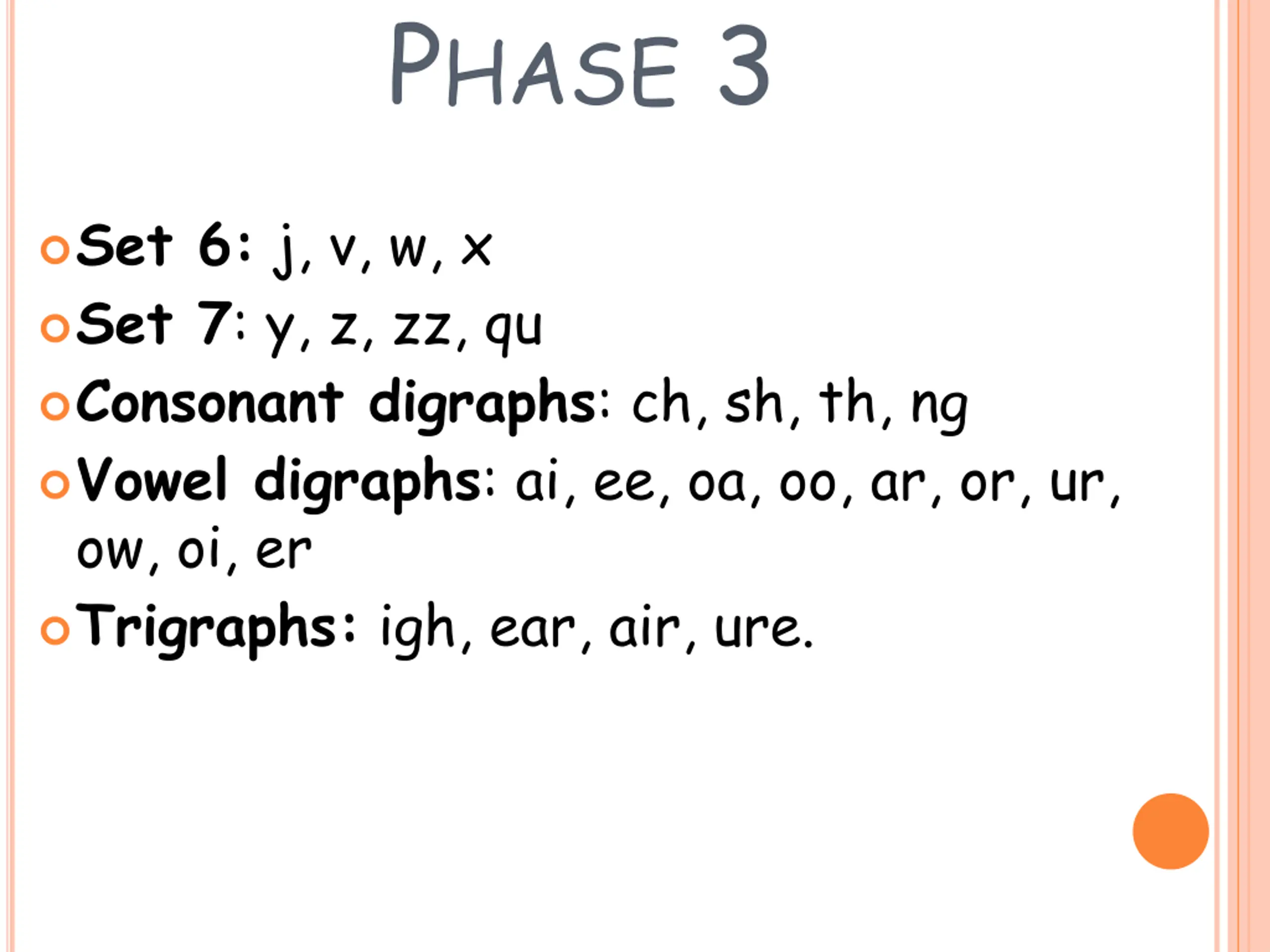 PHASE 3 Set 6: j, v, w, x Set 7: y, z, zz, qu Consonant digraphs: ch, sh, th, ng Vowel digraphs: ai, ee, oa, oo, ar, or, ur, ow, oi, er Trigraphs: igh, ear, air, ure.