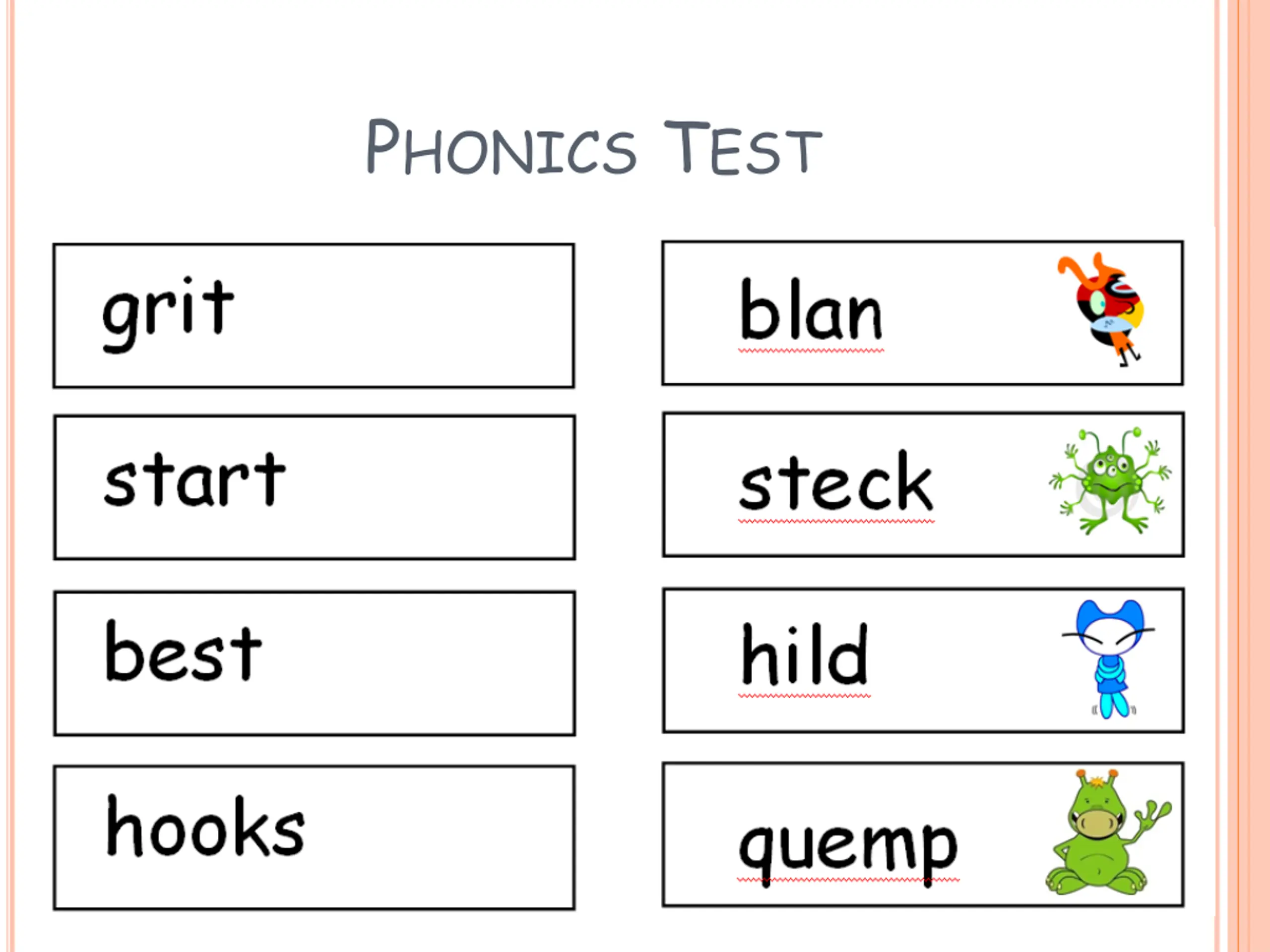 NATIONAL PHONICS SCREENING CHECK Children will take part in a national phonics screening check. The phonics screening check is designed to confirm whether pupils have learnt phonic decoding to an appropriate standard. It will identify pupils who need extra help to improve their decoding skills. The check consists of 20 real words and 20 pseudo-words that a pupil reads aloud to the teacher.