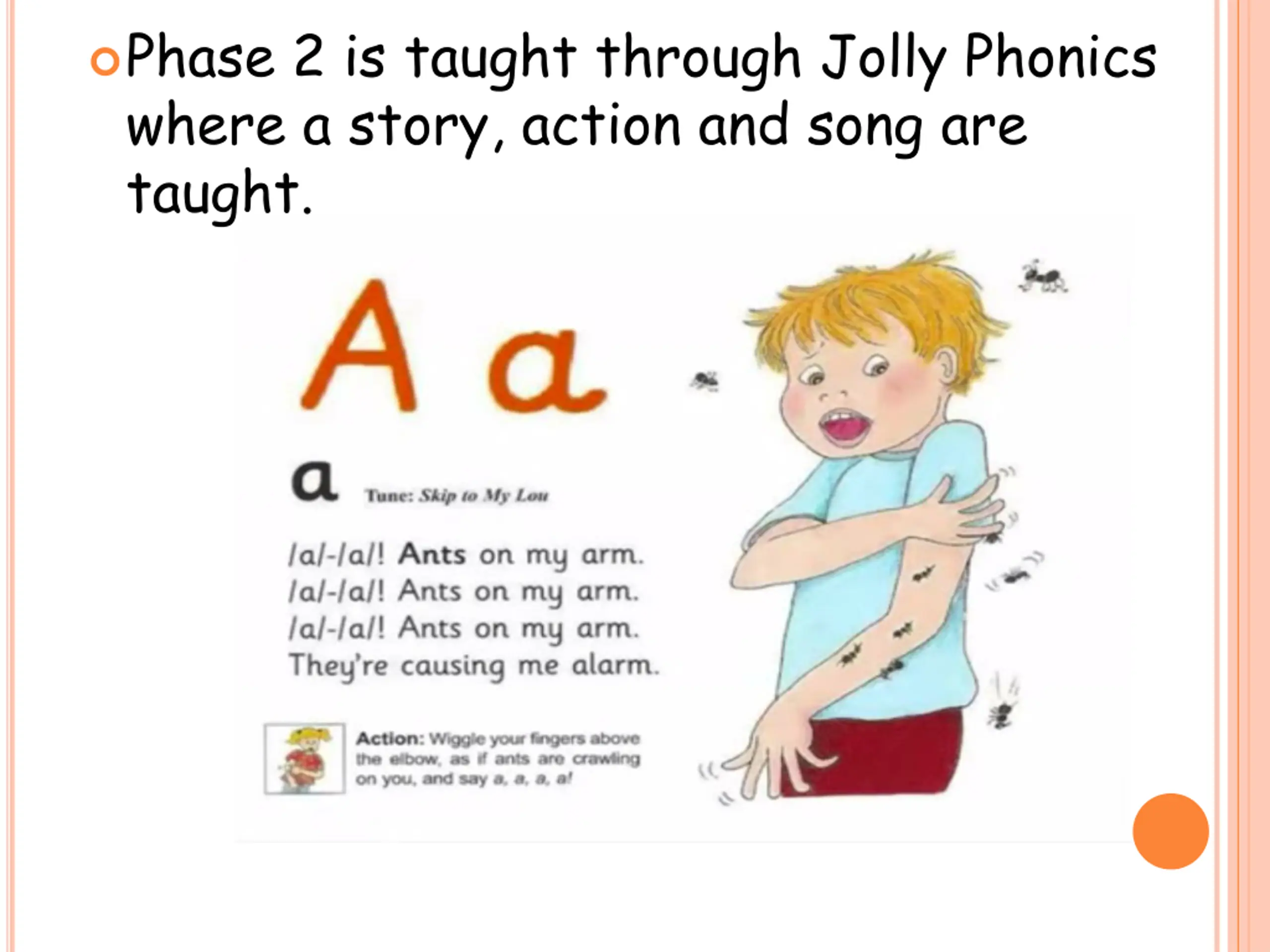 Phase 2 is taught through Jolly Phonics where a story, action and song are taught.