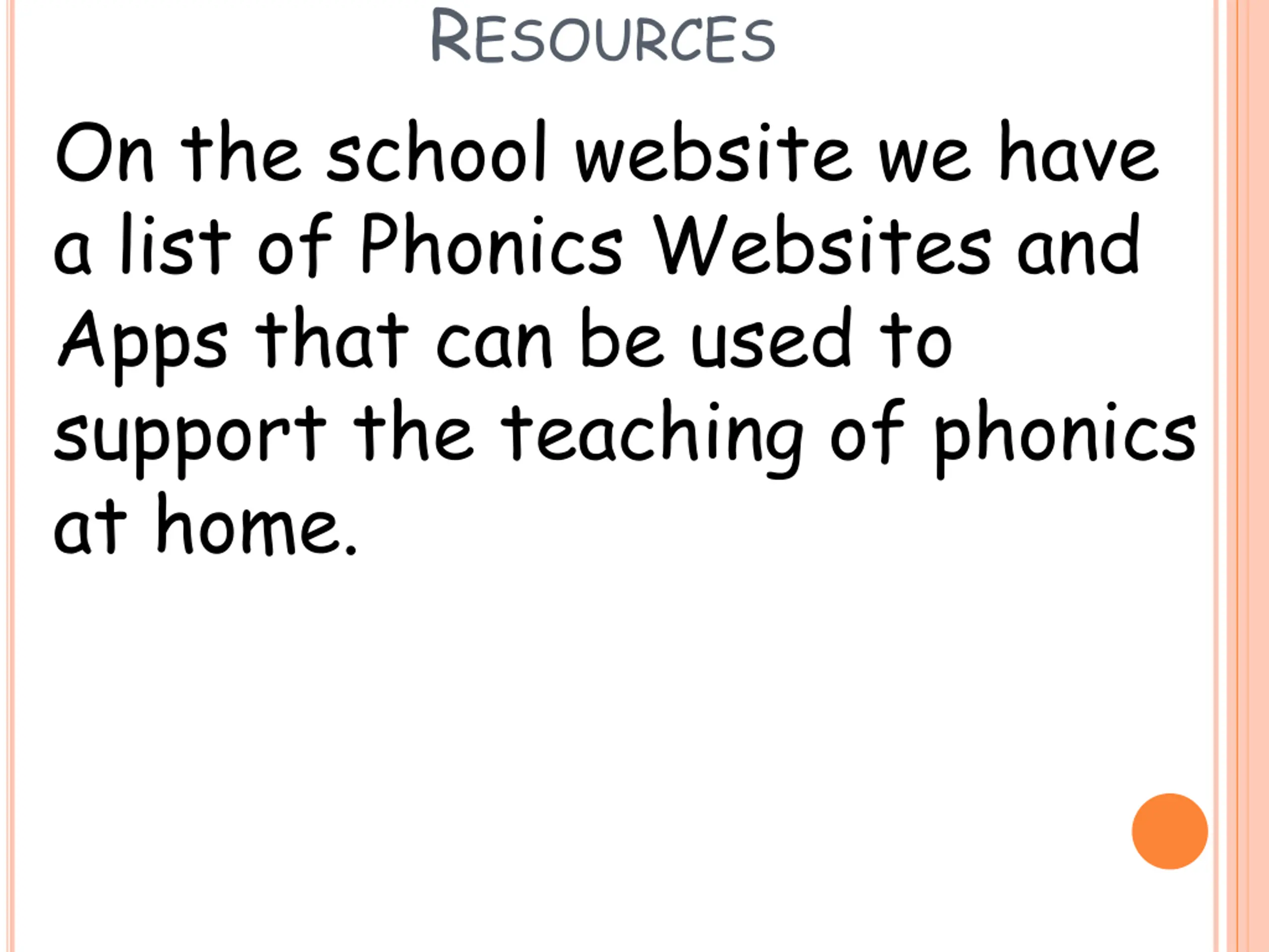 RESOURCES On the school website we have a list of Phonics Websites and Apps that can be used to support the teaching of phonics at home.