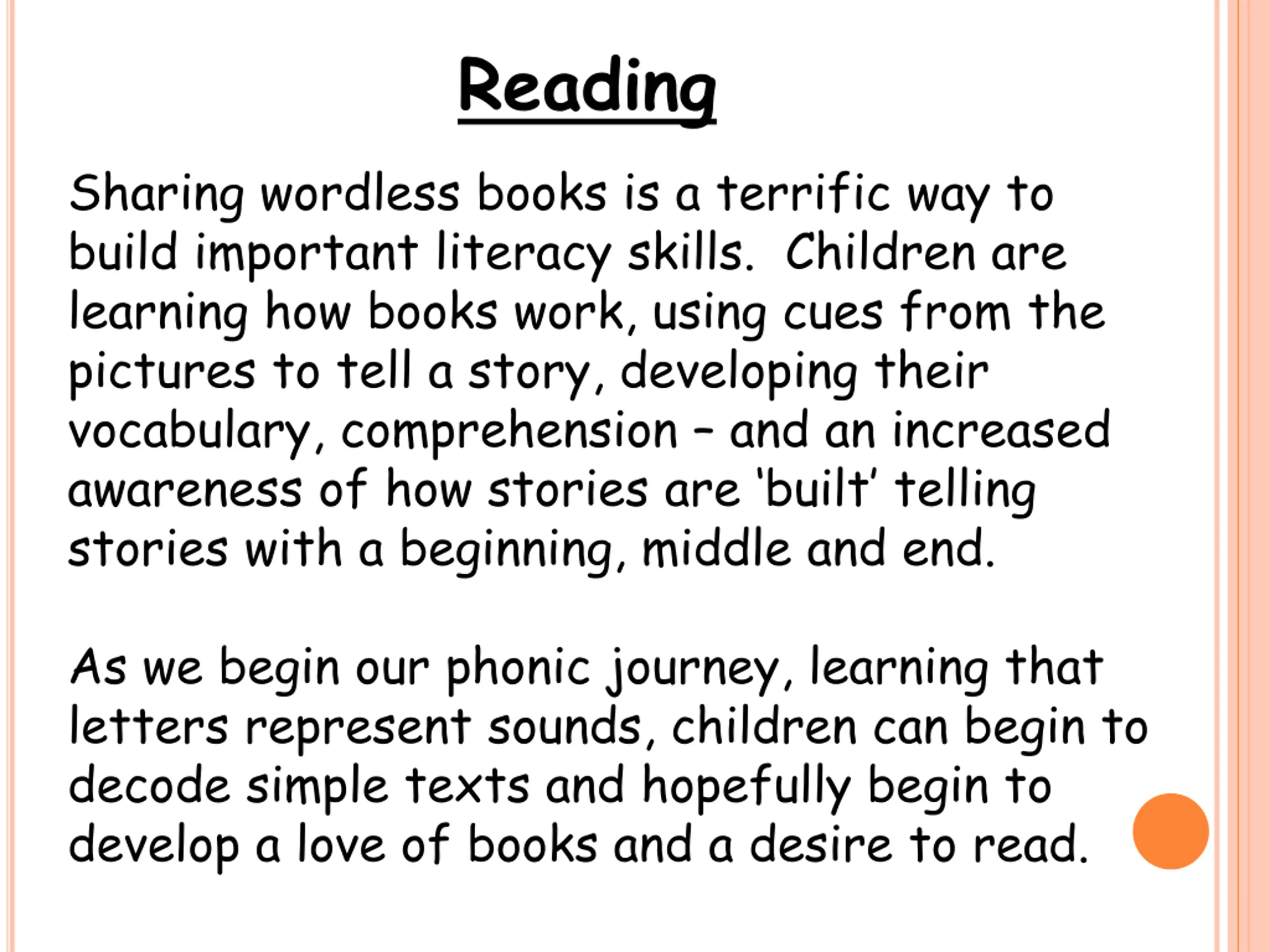 Reading Sharing wordless books is a terrific way to build important literacy skills. Children are learning how books work, using cues from the pictures to tell a story, developing their vocabulary, comprehension and an increased awareness of how stories are built telling stories with a beginning, middle and end. As we begin our phonic journey, learning that letters represent sounds, children can begin to decode simple texts and hopefully begin to develop a love of books and a desire to read.