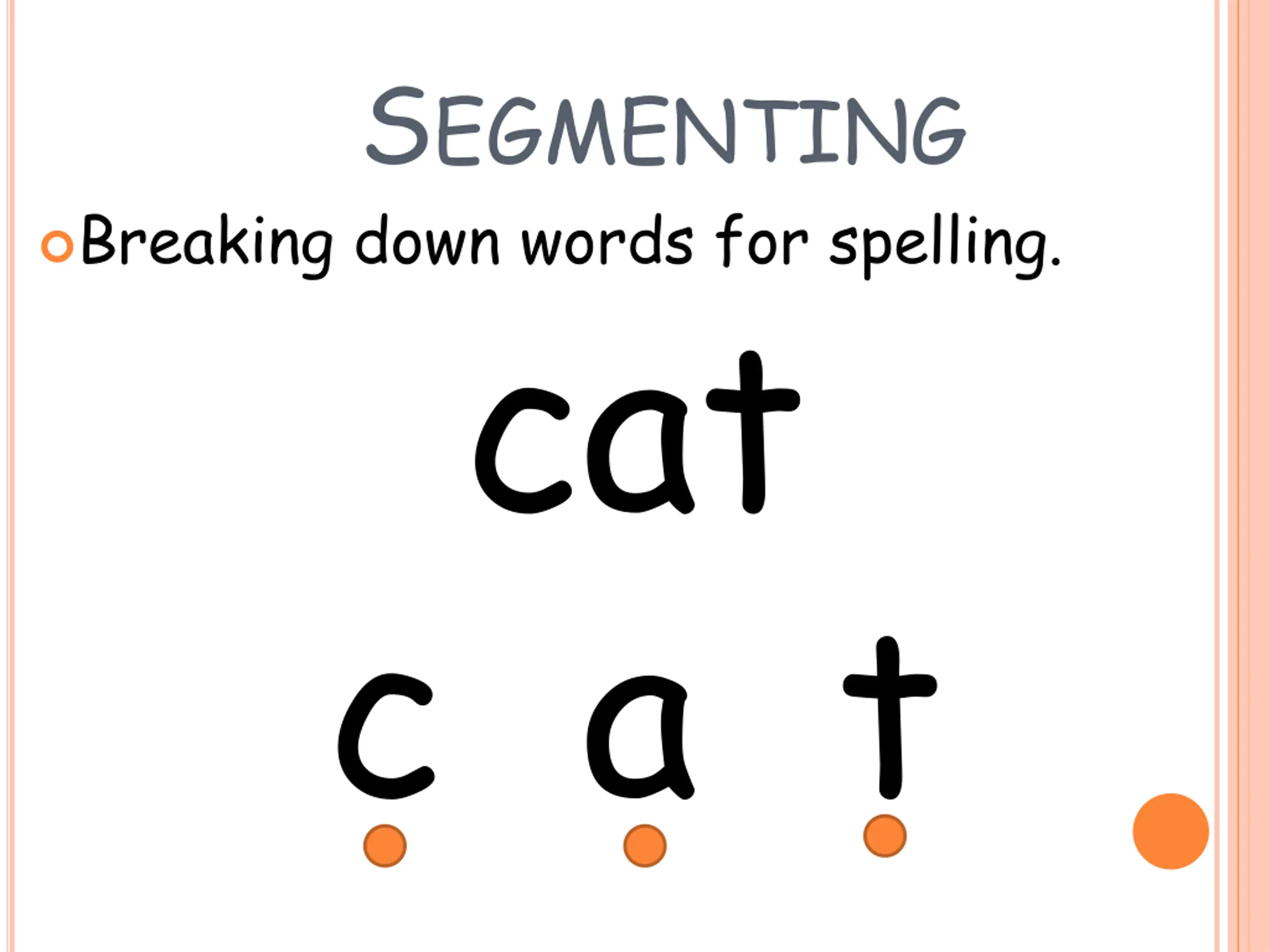 SEGMENTING cat c a t Breaking down words for spelling.