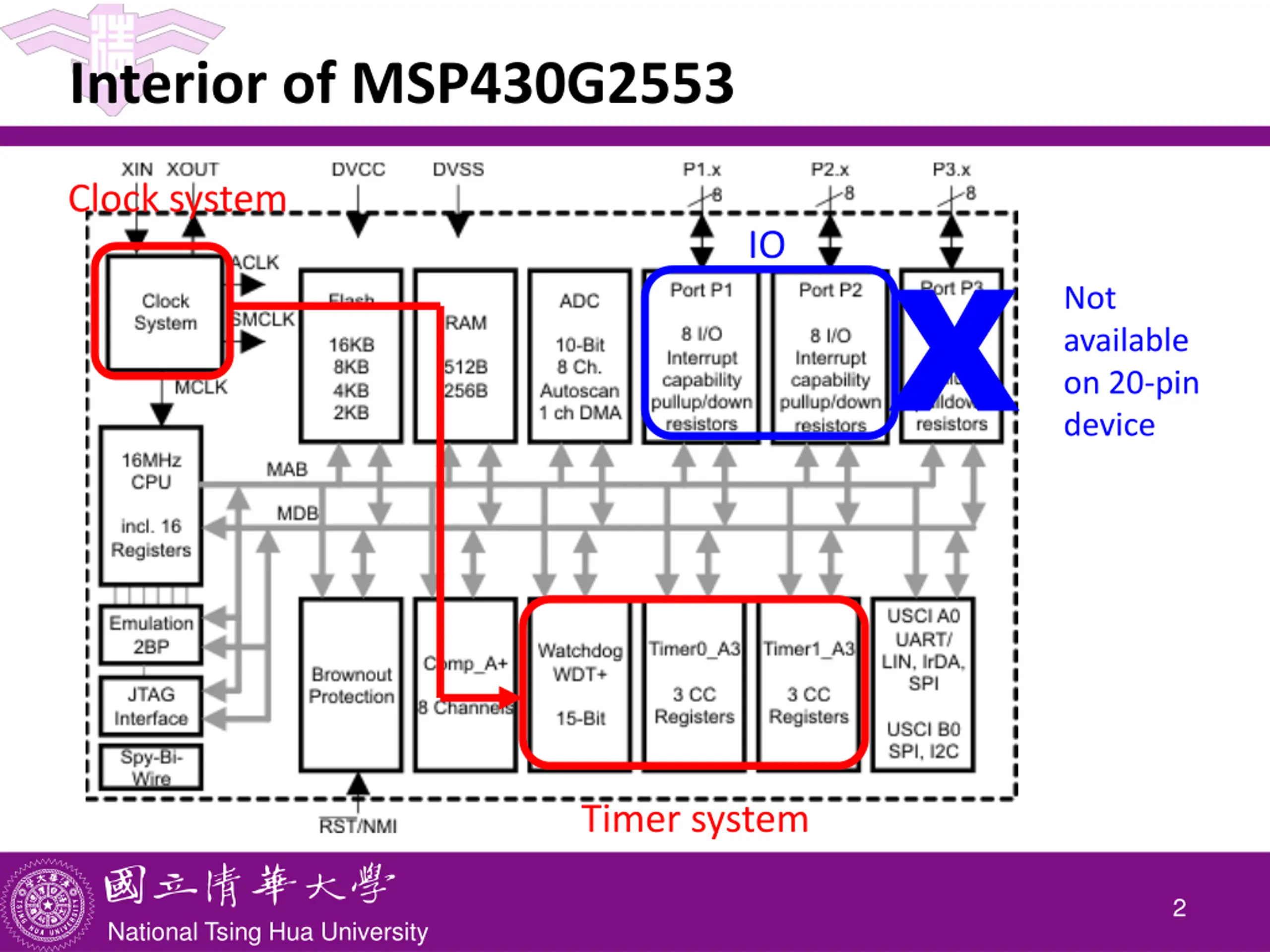 Interior of MSP430G2553 Clock system X IO Not available on 20-pin device Timer system 2 National Tsing Hua University