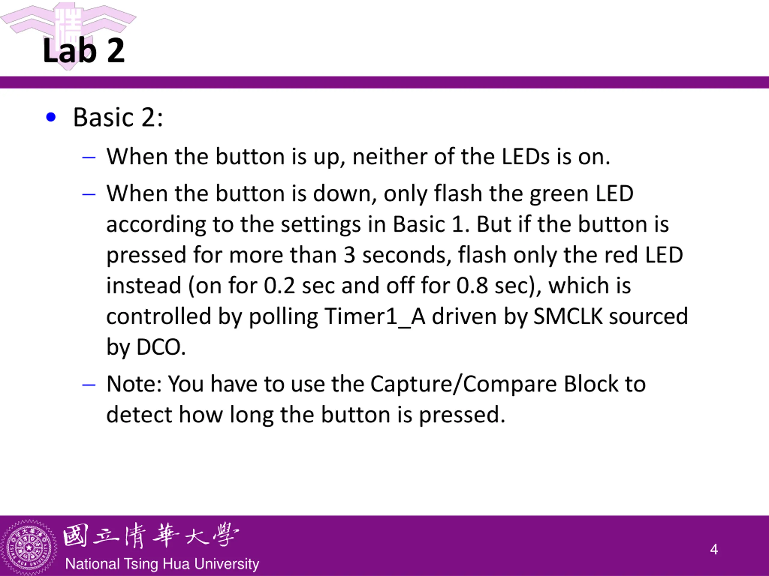 Lab 2 Basic 2: When the button is up, neither of the LEDs is on. When the button is down, only flash the green LED according to the settings in Basic 1. But if the button is pressed for more than 3 seconds, flash only the red LED instead (on for 0.2 sec and off for 0.8 sec), which is controlled by polling Timer1_A driven by SMCLK sourced by DCO. Note: You have to use the Capture/Compare Block to detect how long the button is pressed. 4 National Tsing Hua University