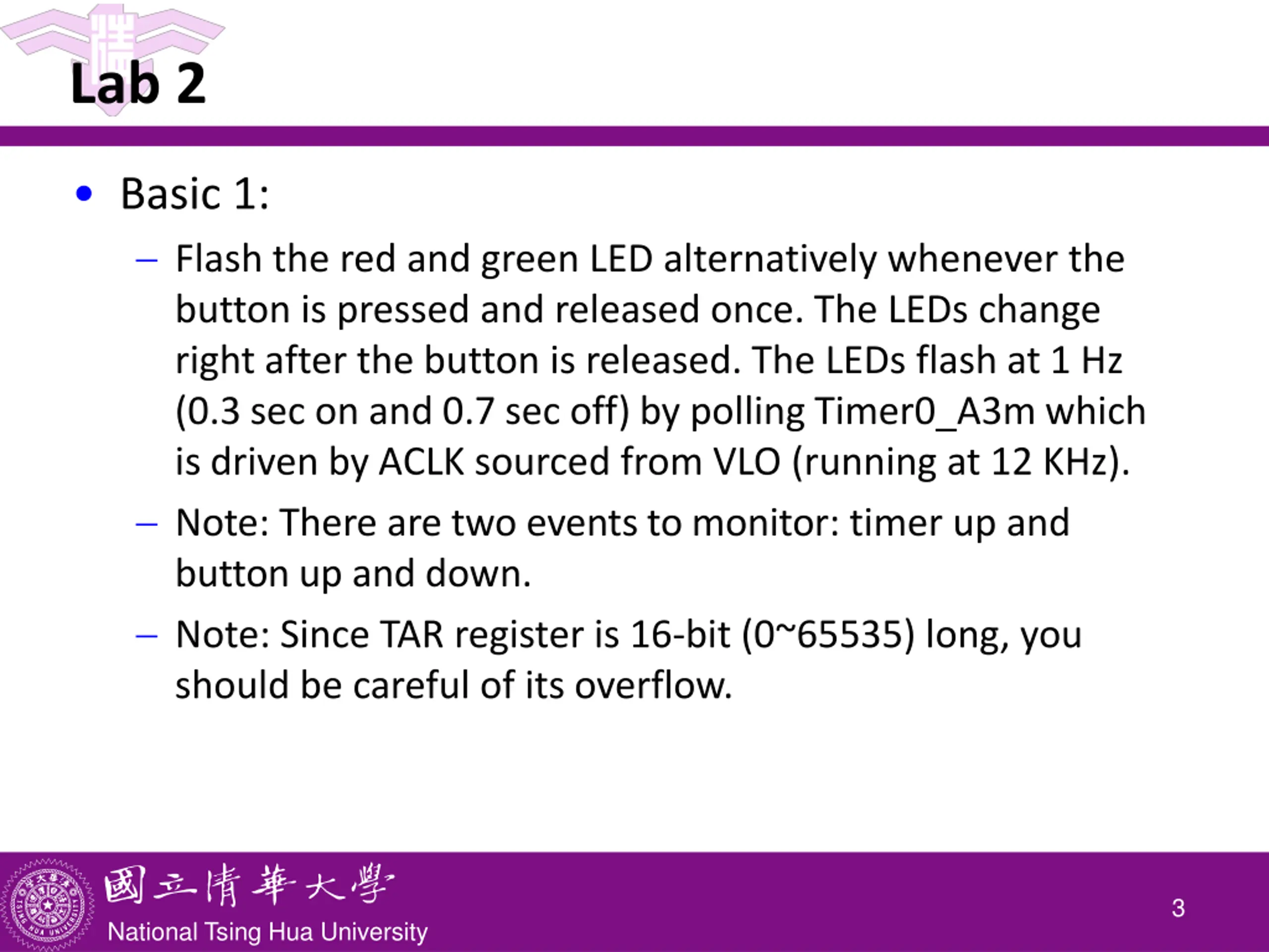 Lab 2 Basic 1: Flash the red and green LED alternatively whenever the button is pressed and released once. The LEDs change right after the button is released. The LEDs flash at 1 Hz (0.3 sec on and 0.7 sec off) by polling Timer0_A3m which is driven by ACLK sourced from VLO (running at 12 KHz). Note: There are two events to monitor: timer up and button up and down. Note: Since TAR register is 16-bit (0~65535) long, you should be careful of its overflow. 3 National Tsing Hua University