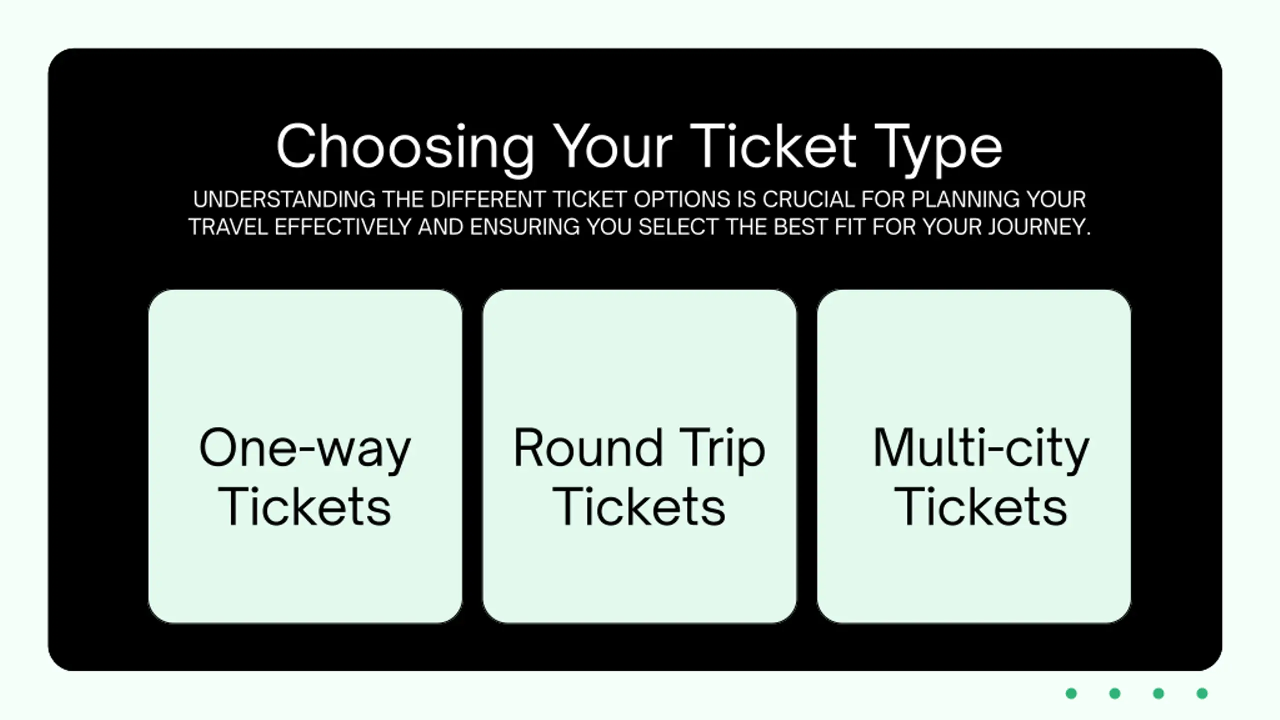 Choosing Your Ticket Type UNDERSTANDING THE DIFFERENT TICKET OPTIONS IS CRUCIAL FOR PLANNING YOUR TRAVEL EFFECTIVELY AND ENSURING YOU SELECT THE BEST FIT FOR YOUR JOURNEY. One-way Tickets Round Trip Tickets Multi-city Tickets