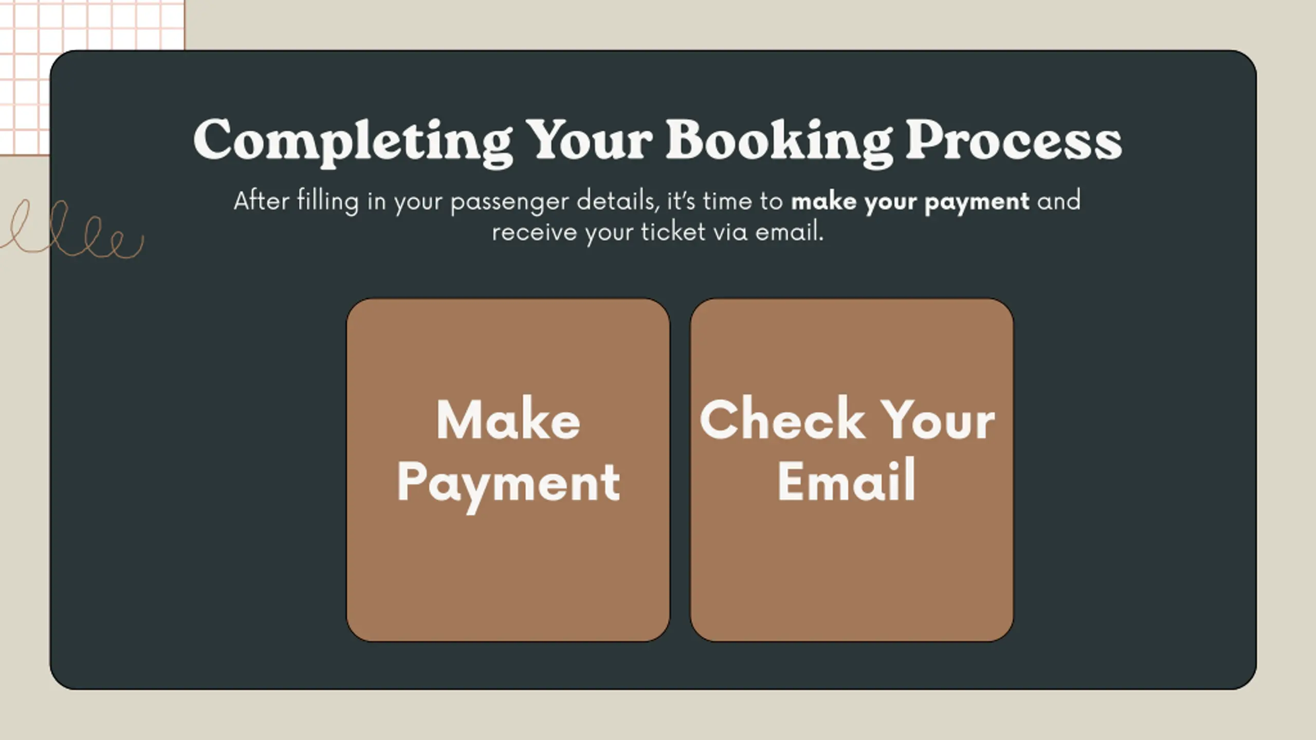 Completing Your Booking Process After filling in your passenger details, it s time to make your payment and receive your ticket via email. Make Payment Check Your Email